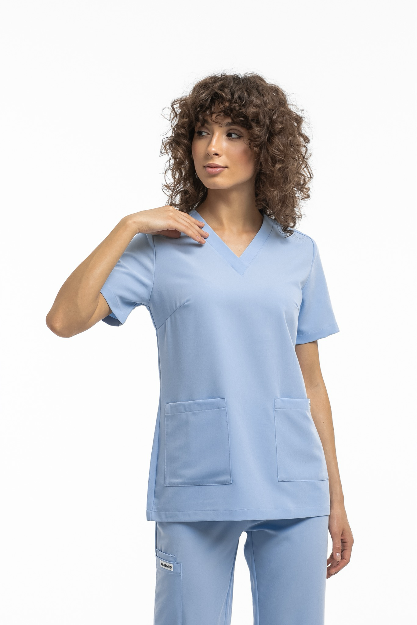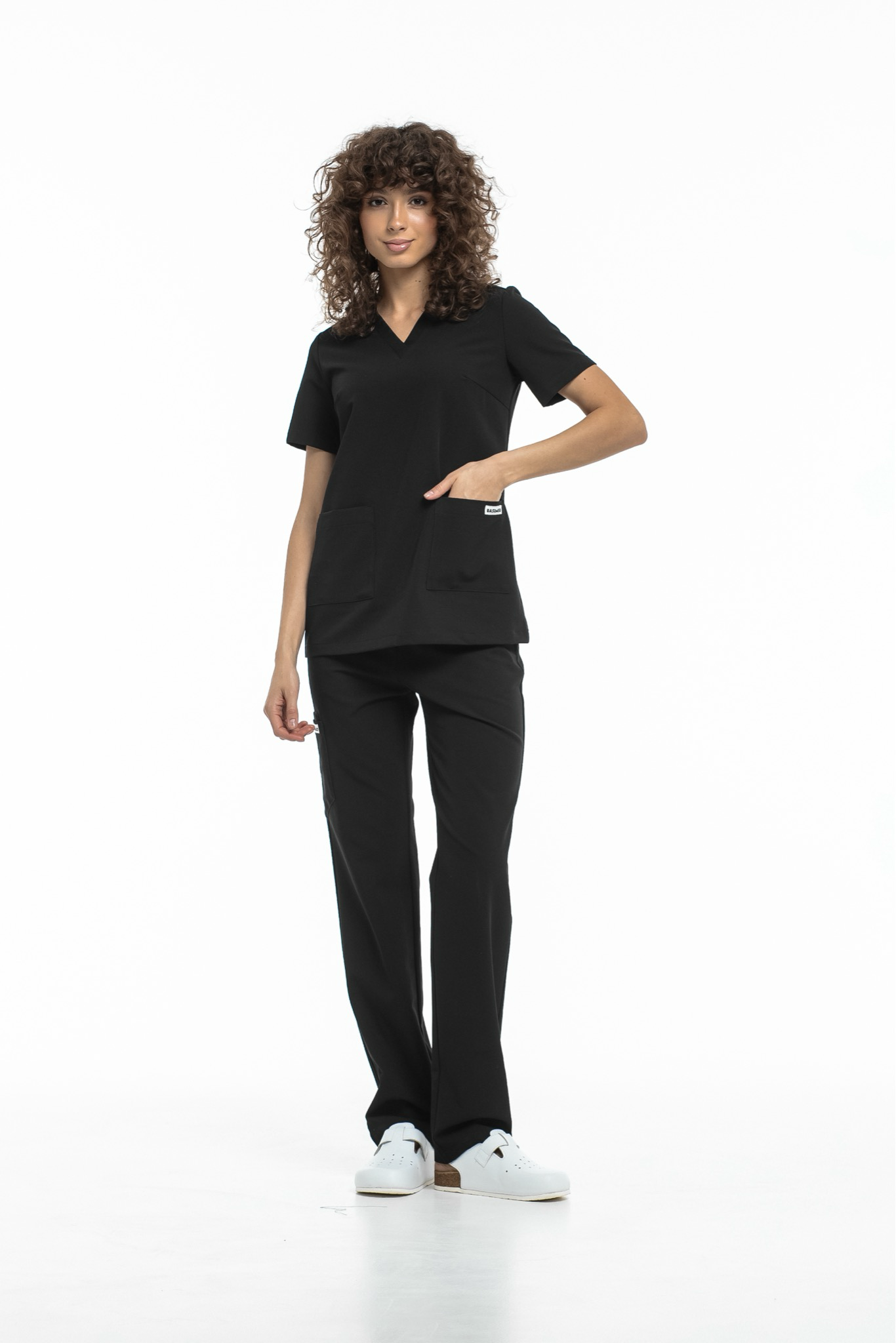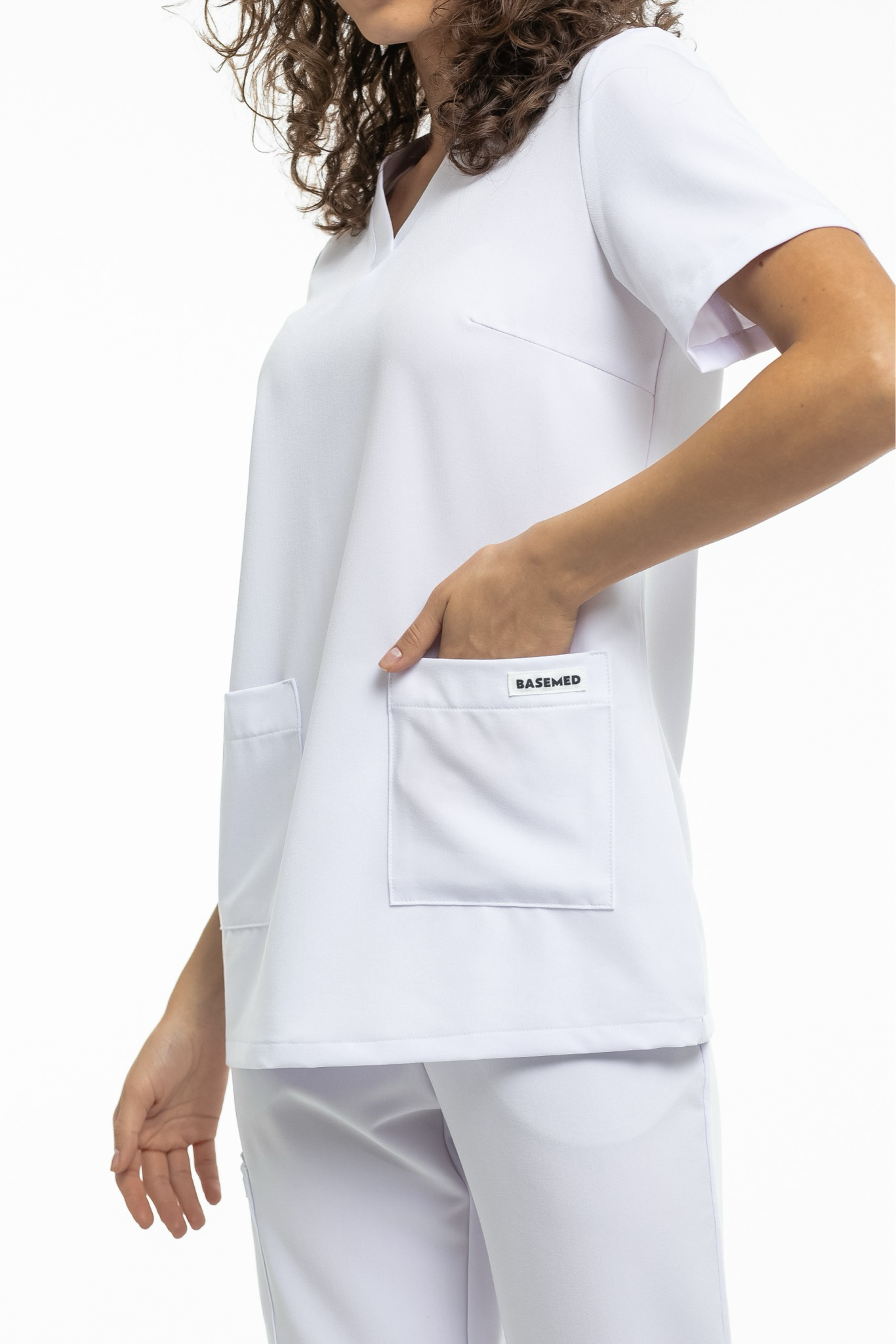 Свободная блуза прямого кроя с классическим воротником-треугольником, двумя накладными вместительными карманами спереди. Короткий рукав и удобная для работы длина.