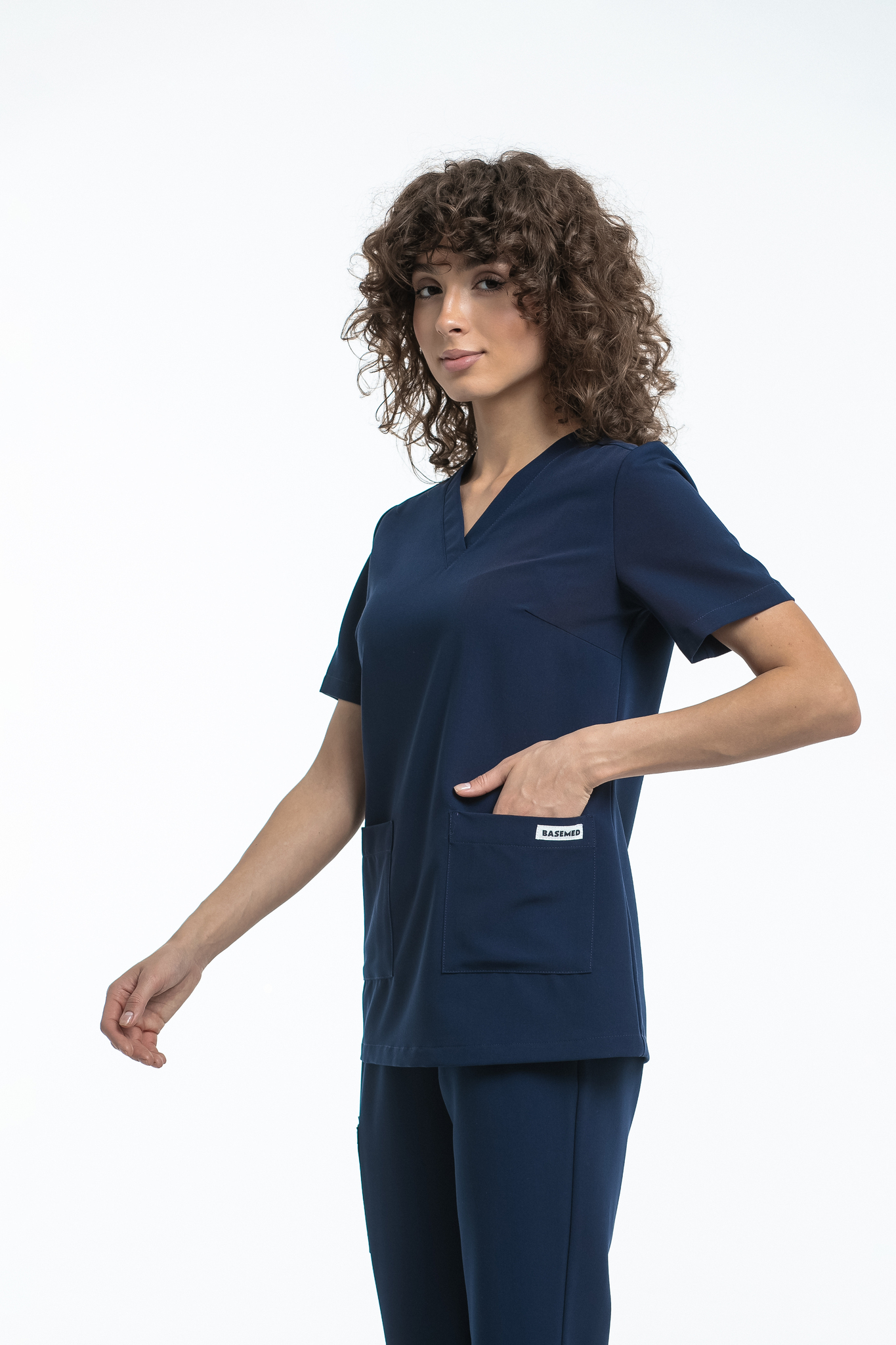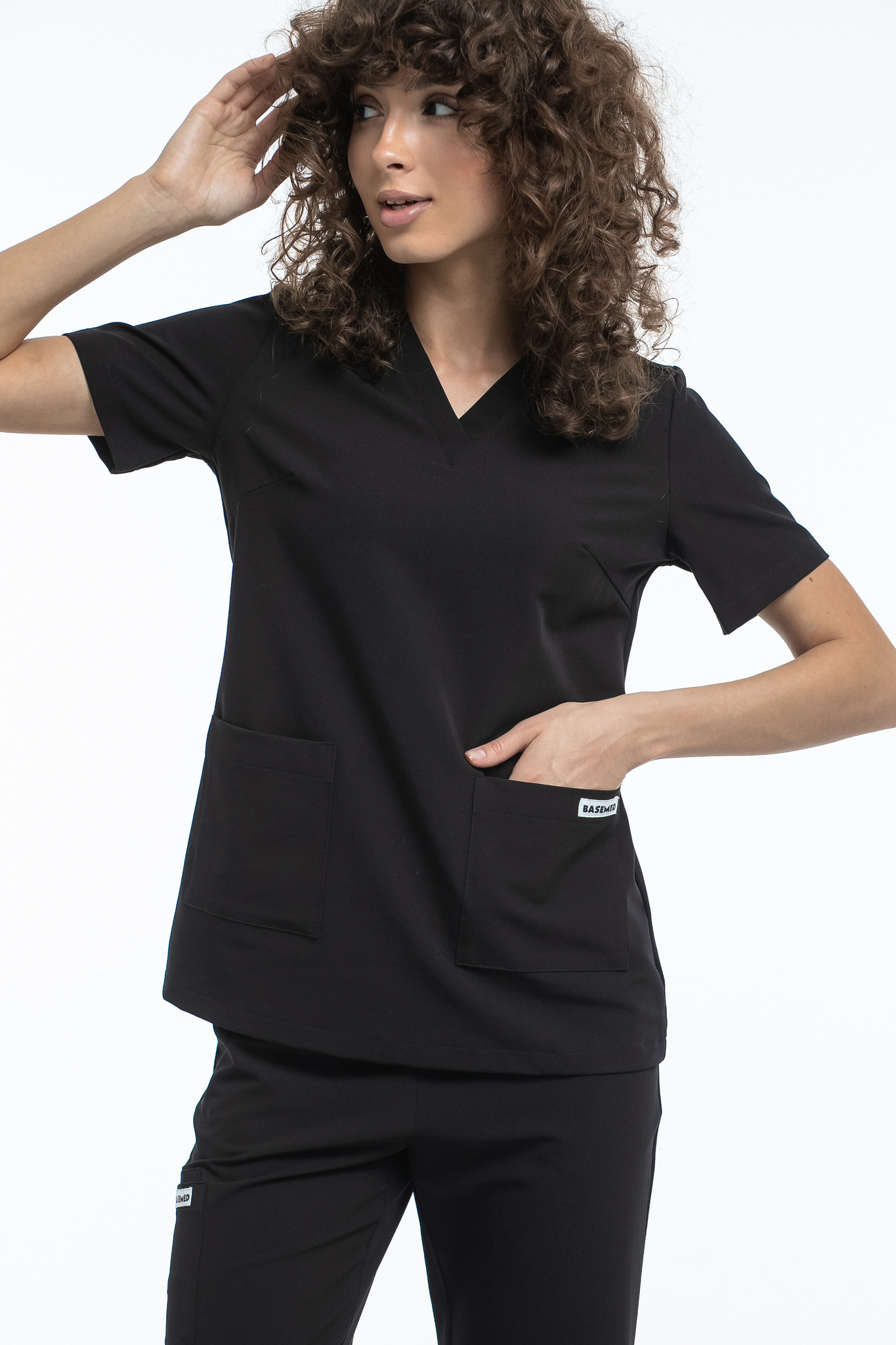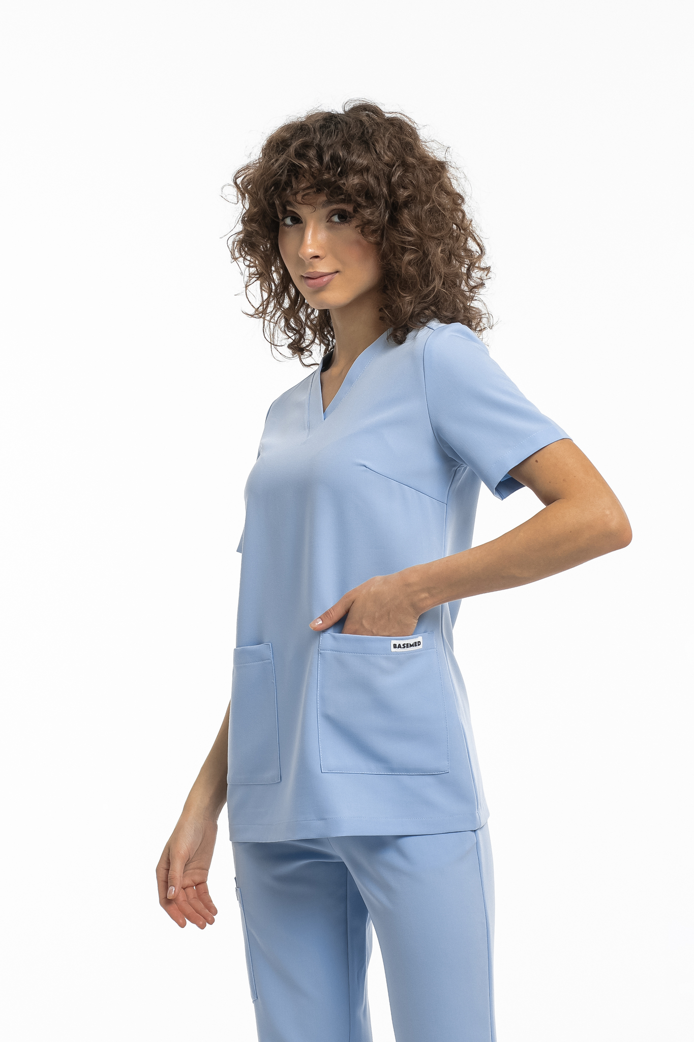 Свободная блуза прямого кроя с классическим воротником-треугольником, двумя накладными вместительными карманами спереди. Короткий рукав и удобная для работы длина.