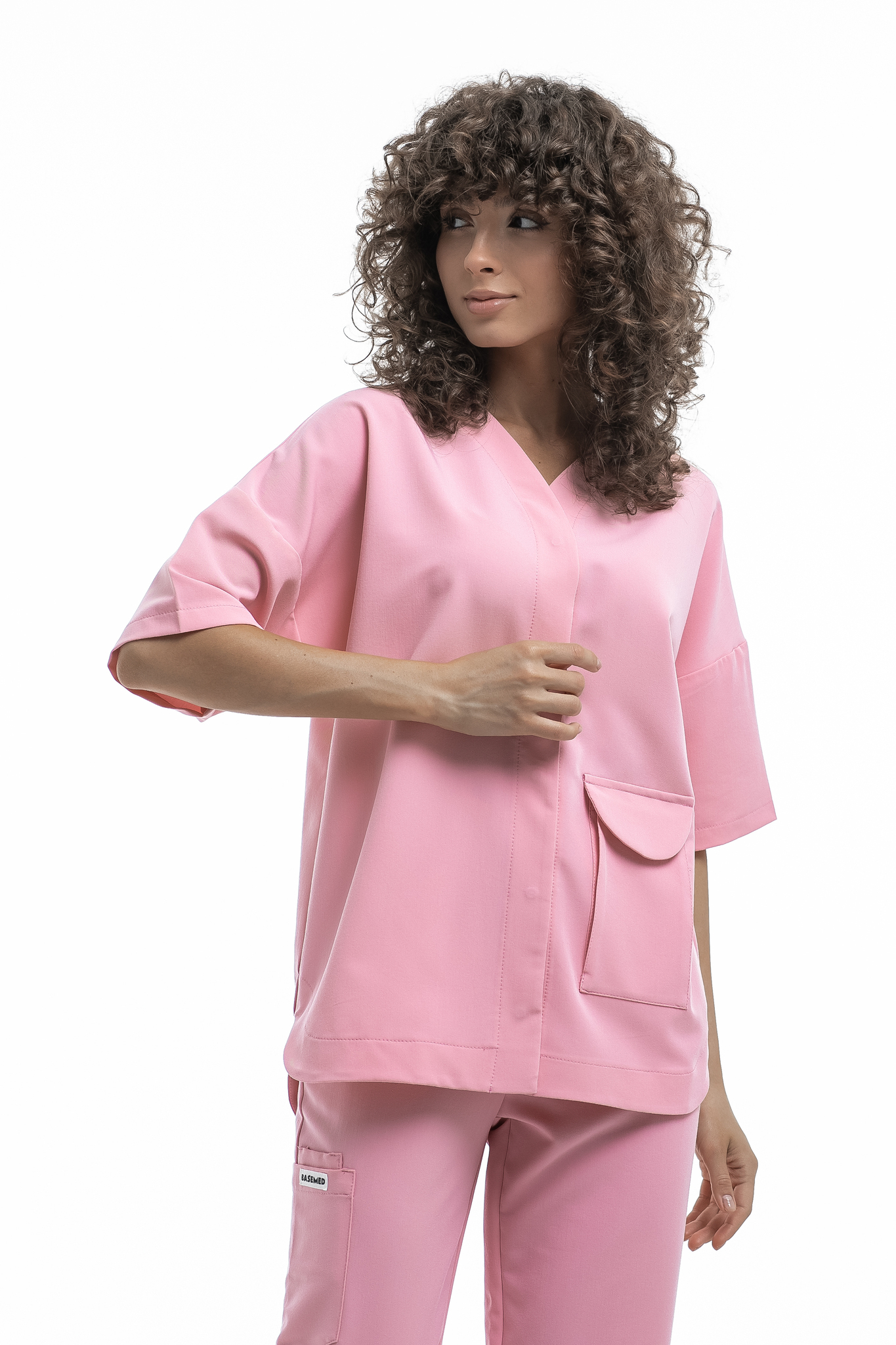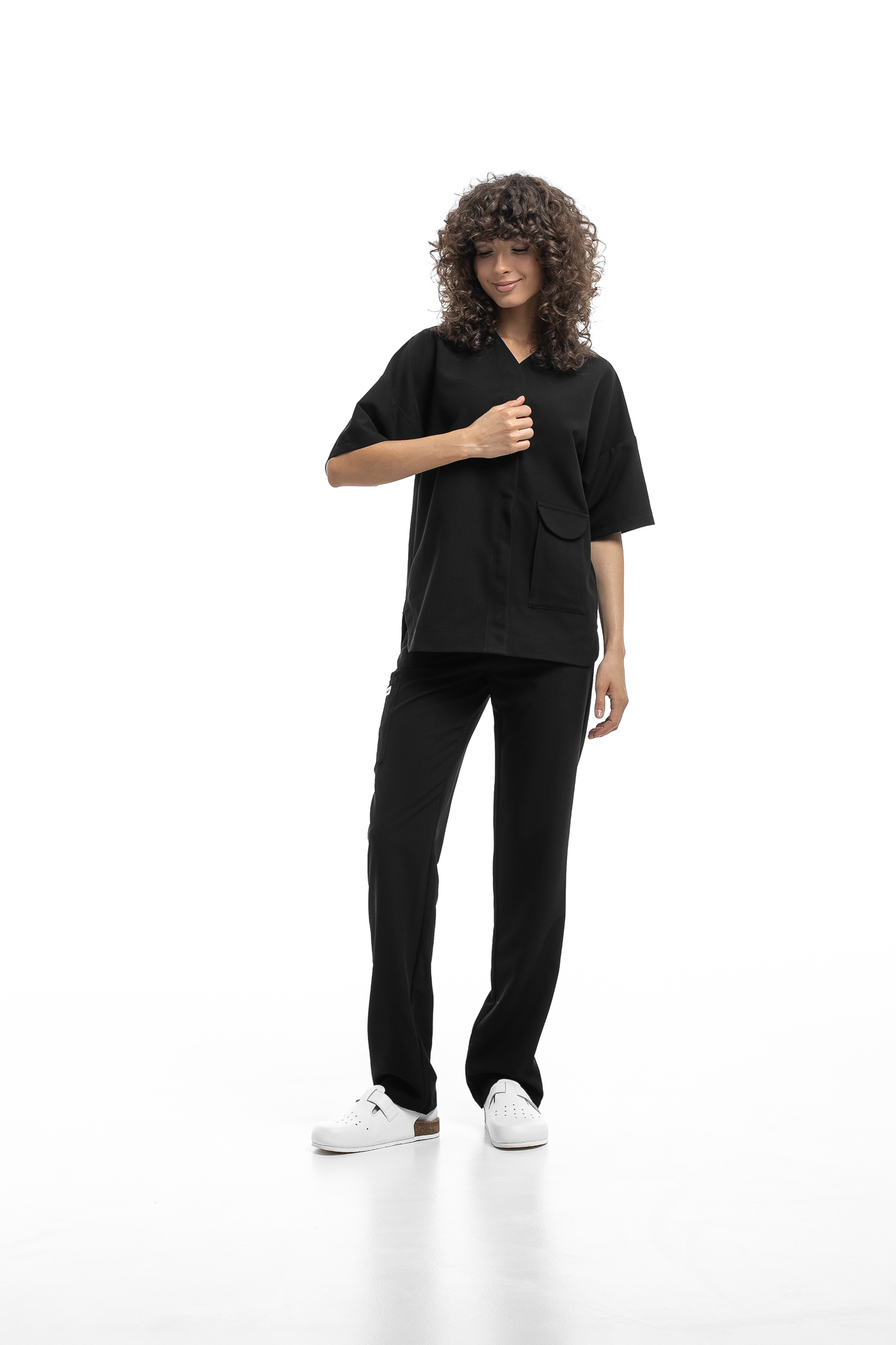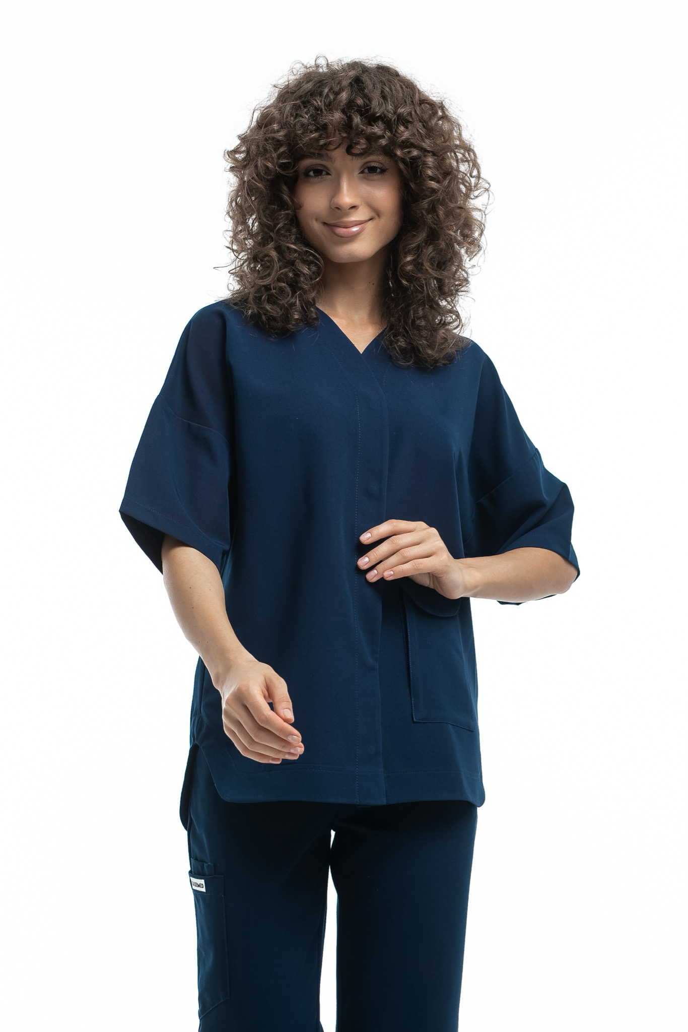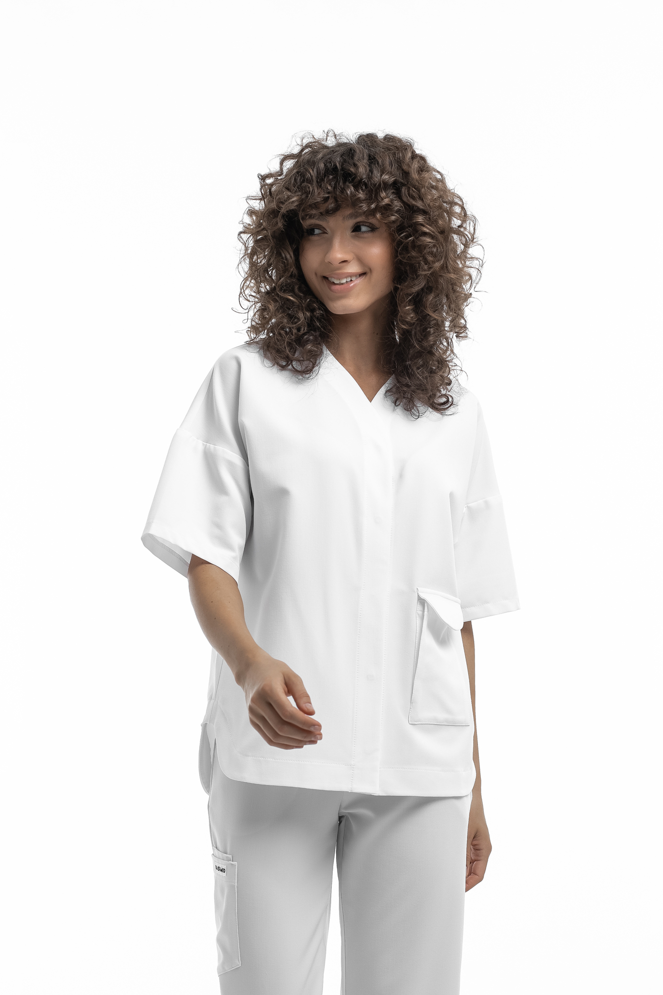 Новое изделие коллекции Freedom, сочетающее в себе практичность и комфорт. Блуза плотно застегивается на кнопки, имеет V образный вырез на горловине и вместительный накладной карман спереди. Свободный расслабленный силуэт обеспечивает комфорт в работе и не сковывает движения.