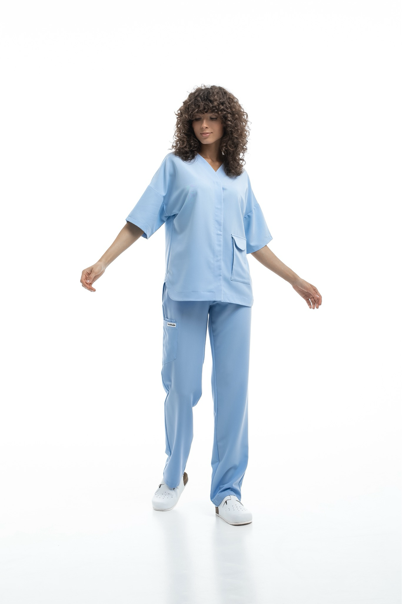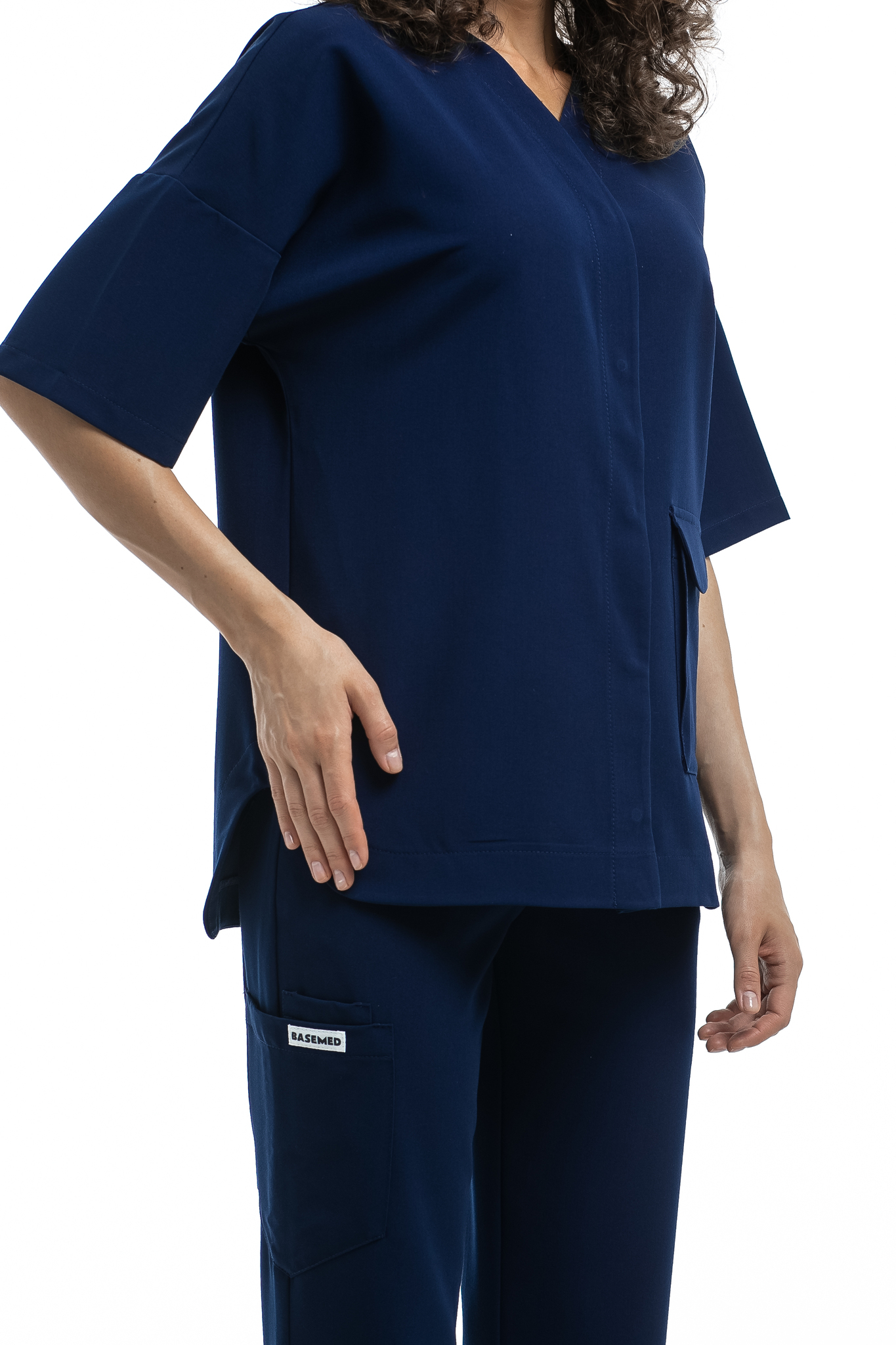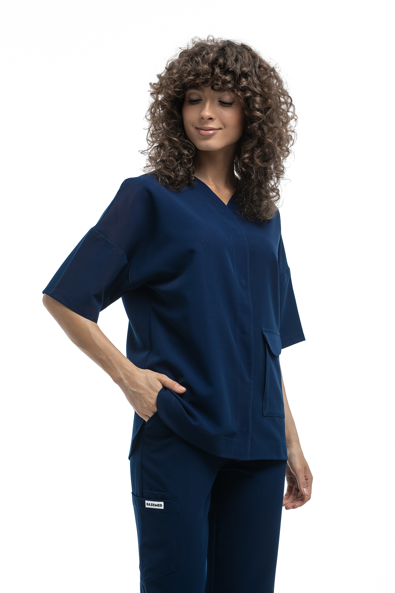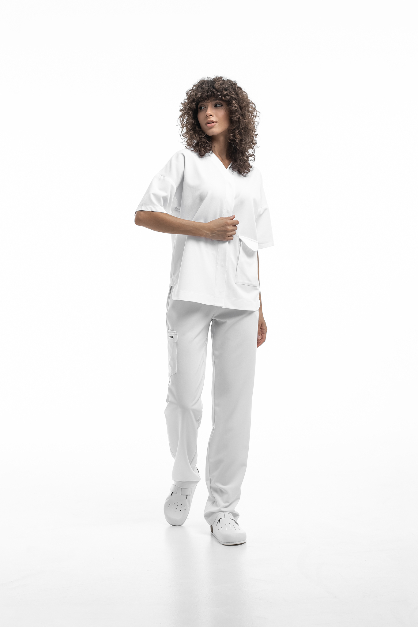 Новое изделие коллекции Freedom, сочетающее в себе практичность и комфорт. Блуза плотно застегивается на кнопки, имеет V образный вырез на горловине и вместительный накладной карман спереди. Свободный расслабленный силуэт обеспечивает комфорт в работе и не сковывает движения.