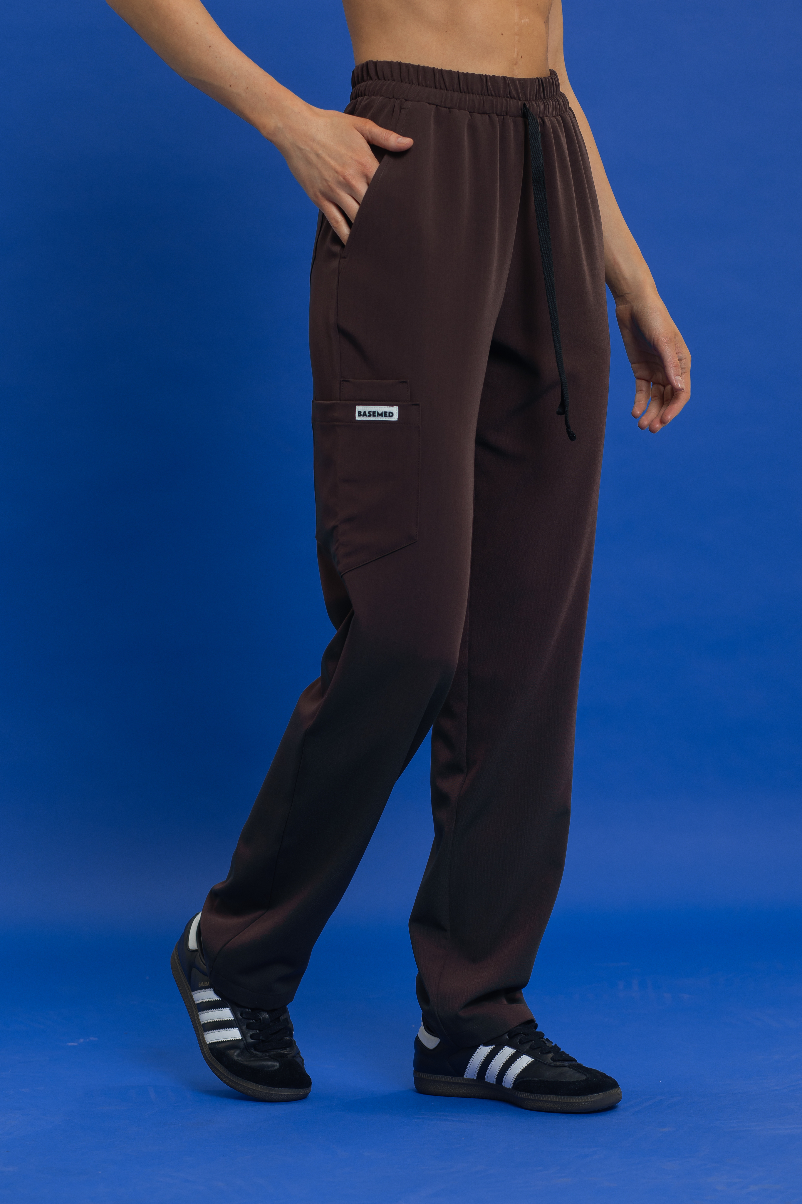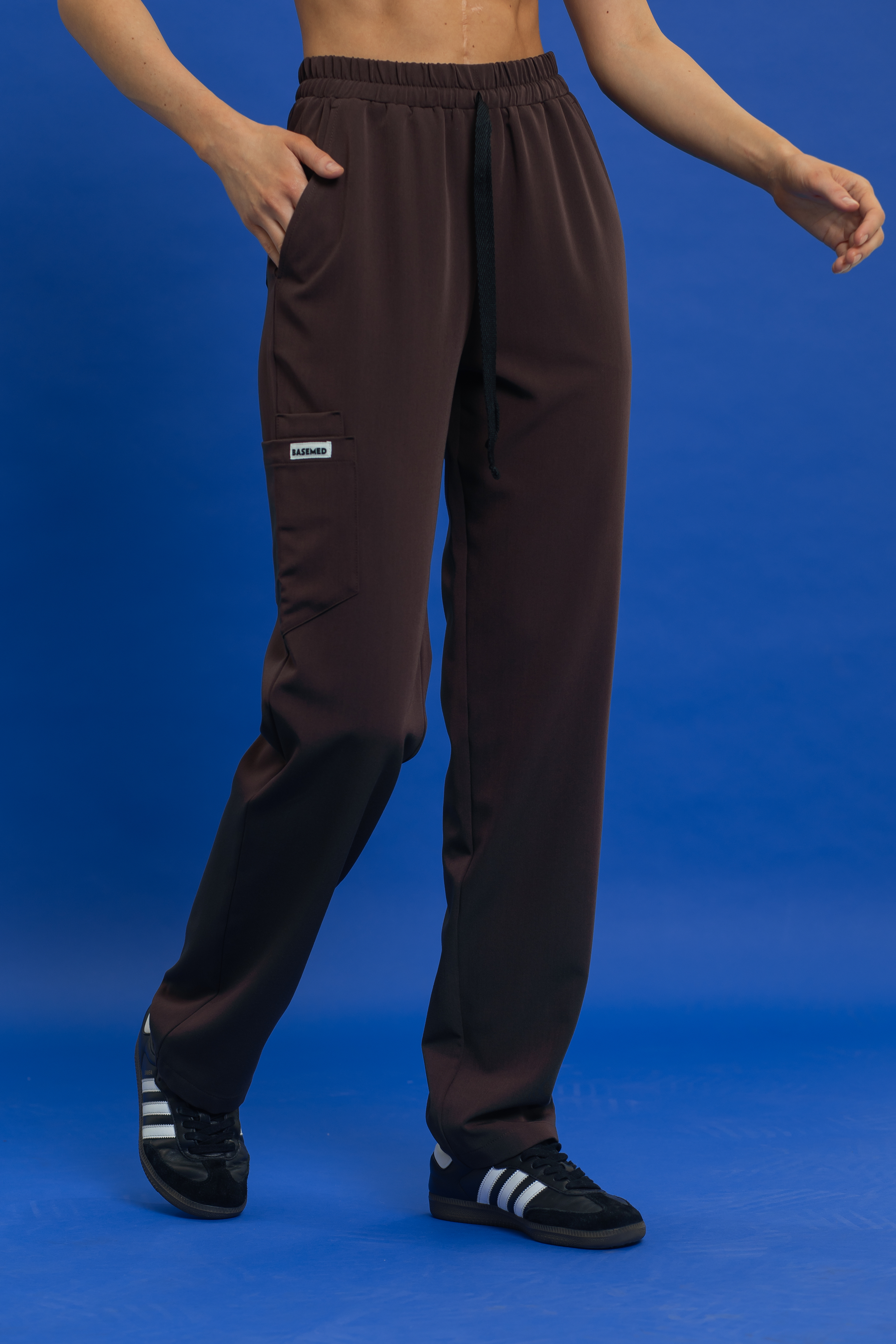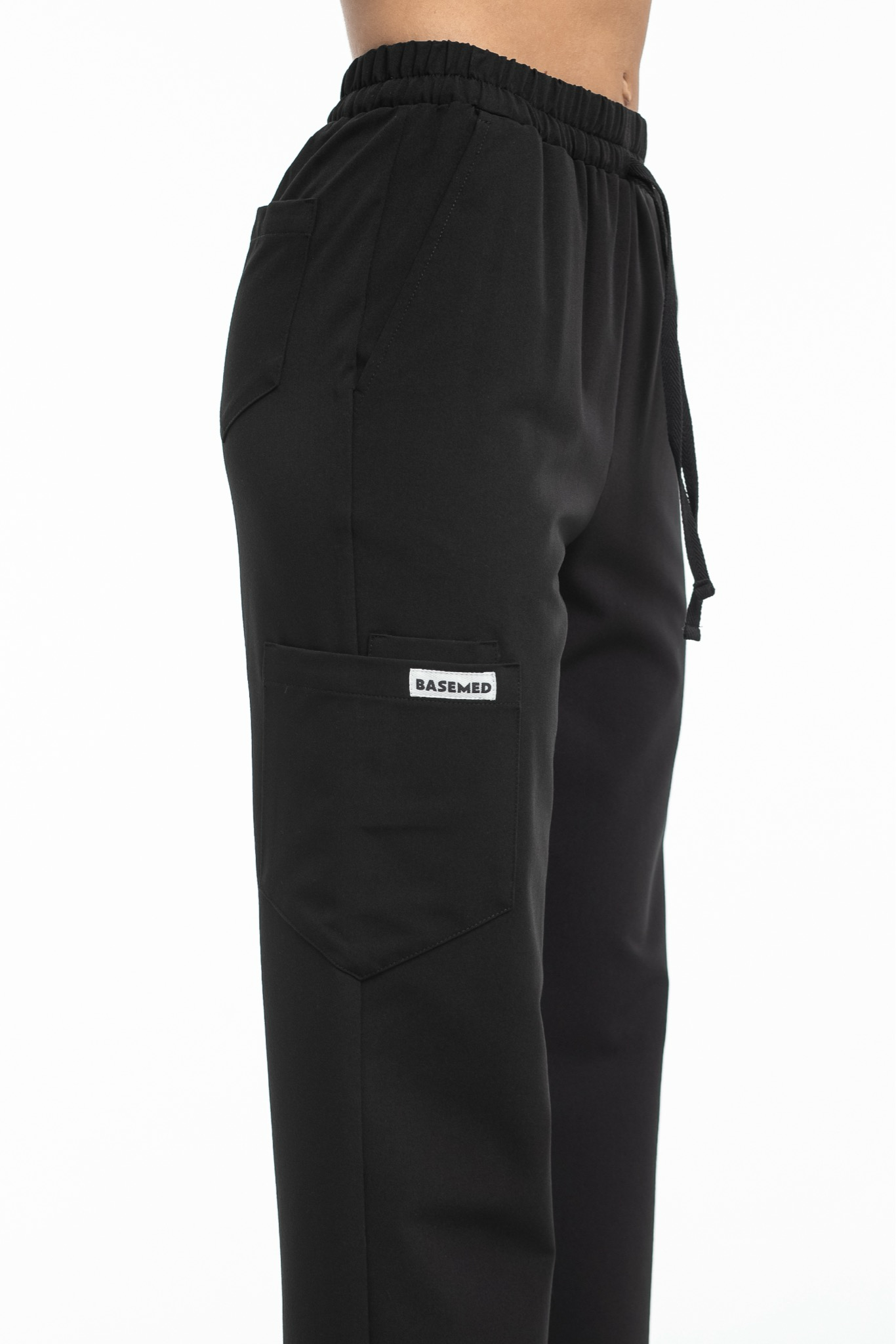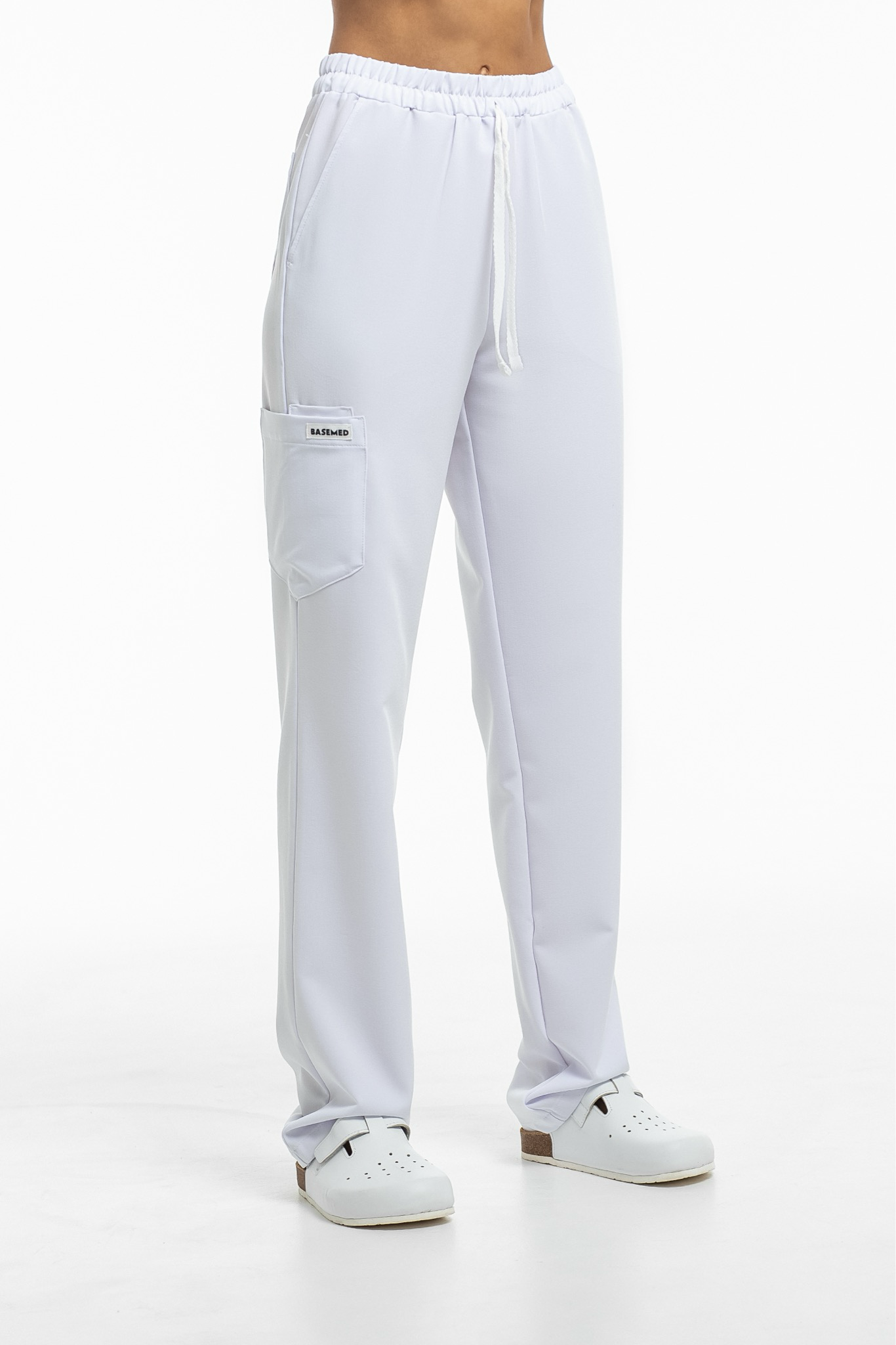Прямые брюки на резинке и на завязках. Эта модель позволит с комфортом отработать даже самую долгую смену за счет удобной посадки и возможности отрегулировать брюки в зоне талии. На брюках есть 6 карманов: 2 передних, 2 задних и 2 накладных на левой штанине.