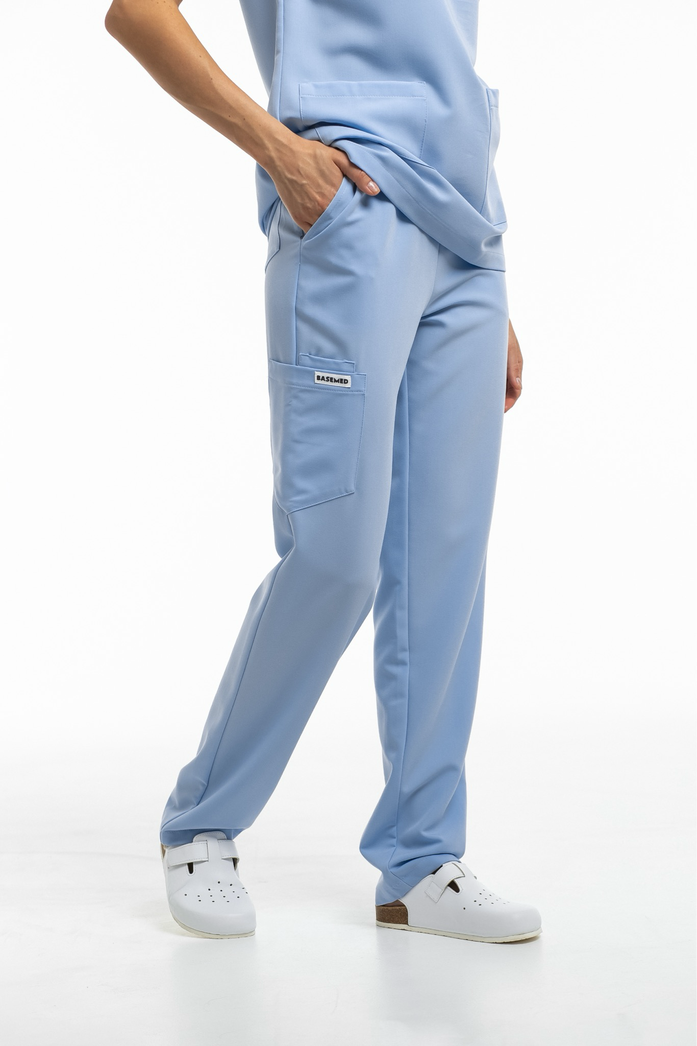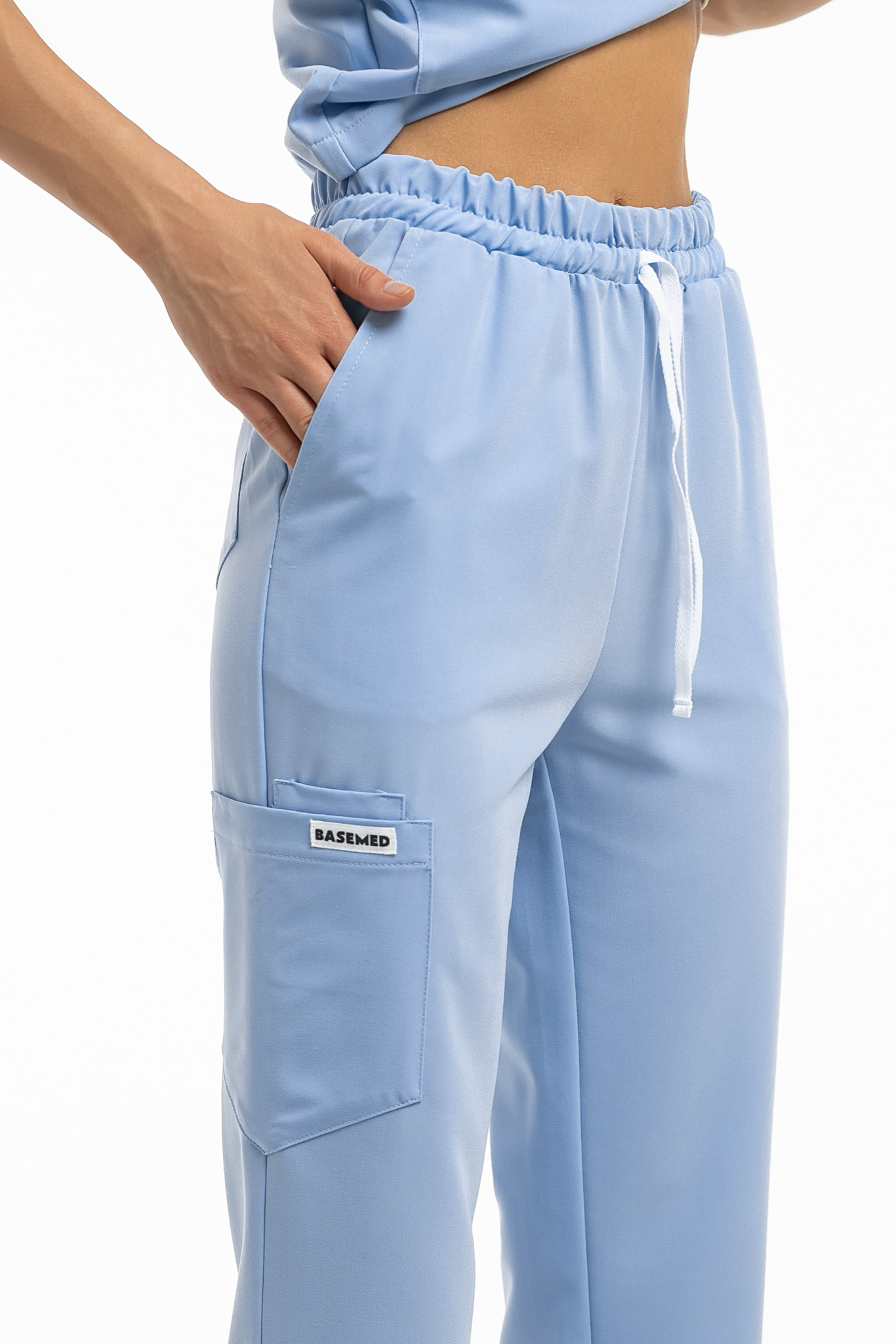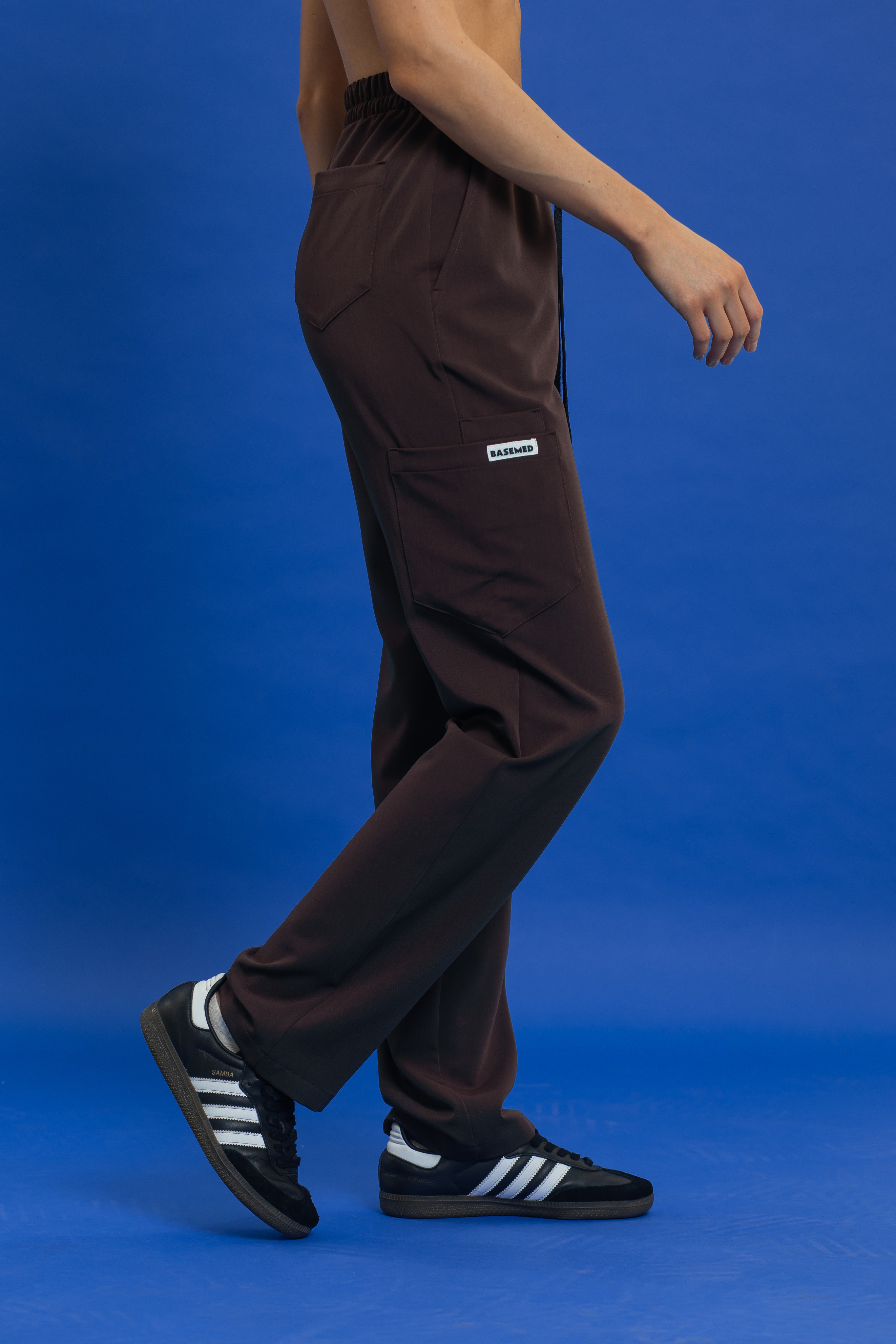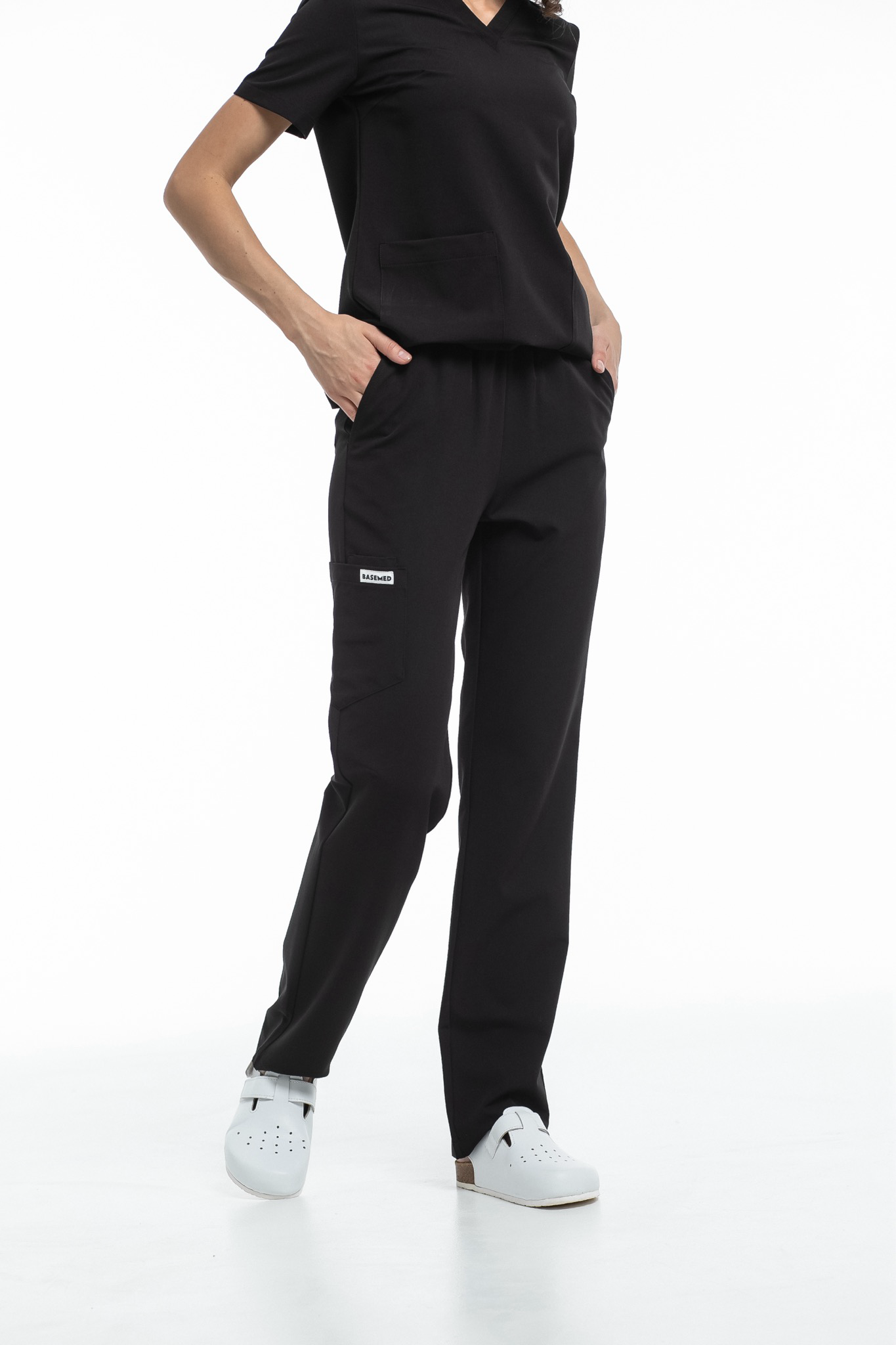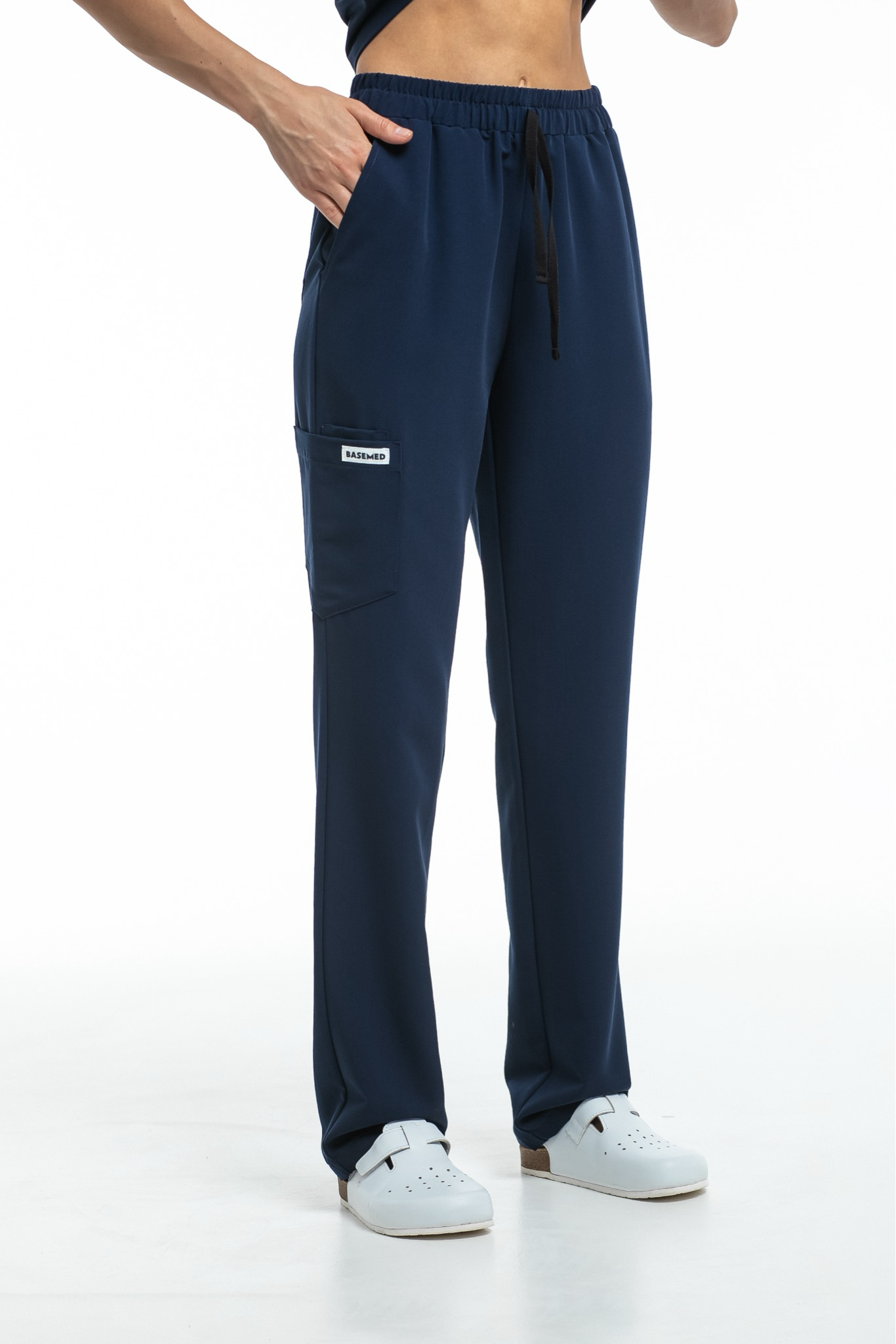 Прямые брюки на резинке и на завязках. Эта модель позволит с комфортом отработать даже самую долгую смену за счет удобной посадки и возможности отрегулировать брюки в зоне талии. На брюках есть 6 карманов: 2 передних, 2 задних и 2 накладных на левой штанине.