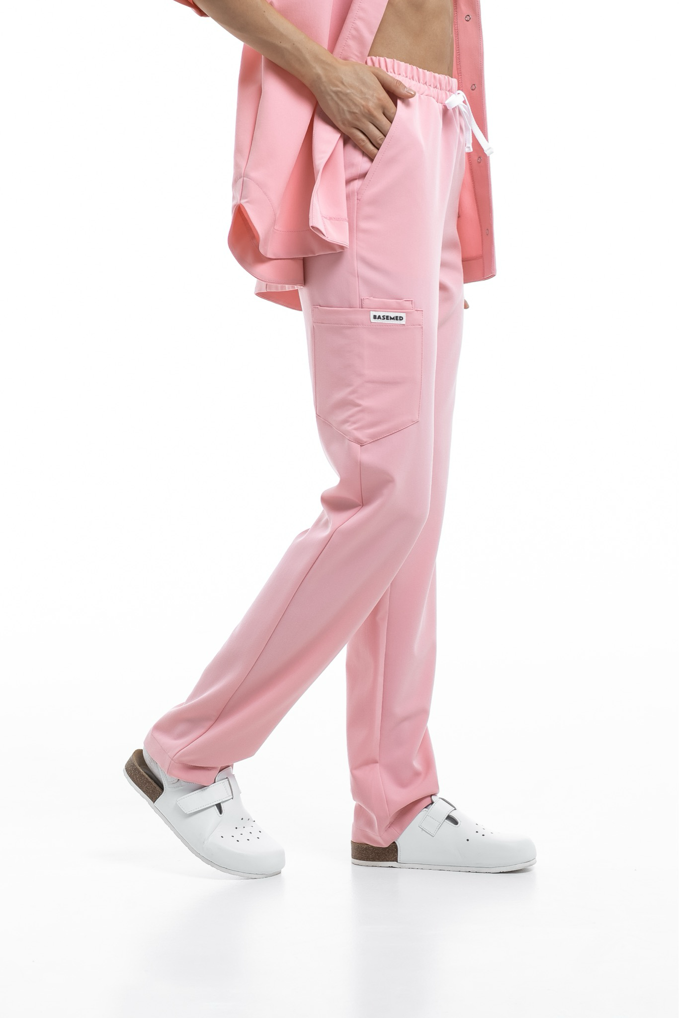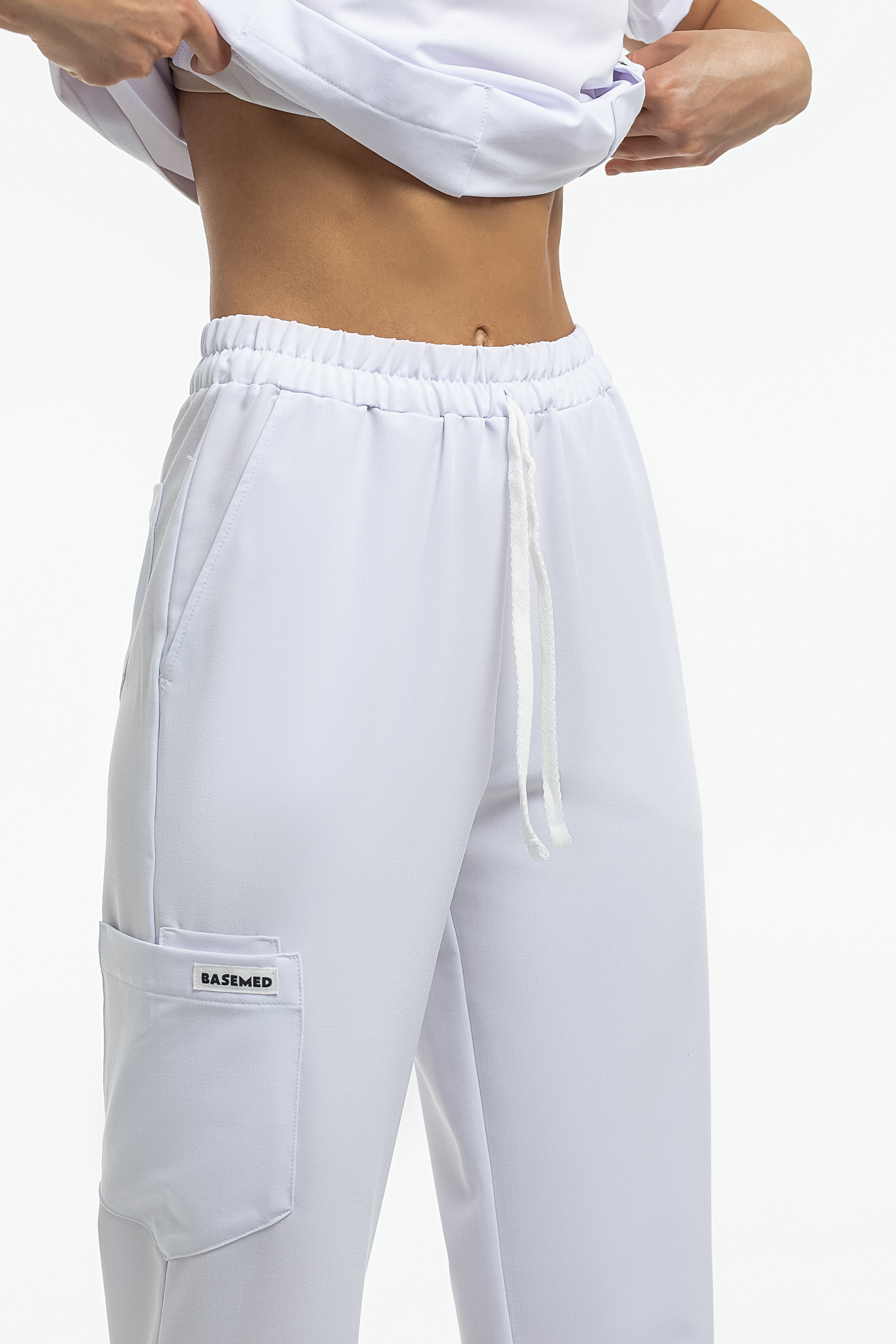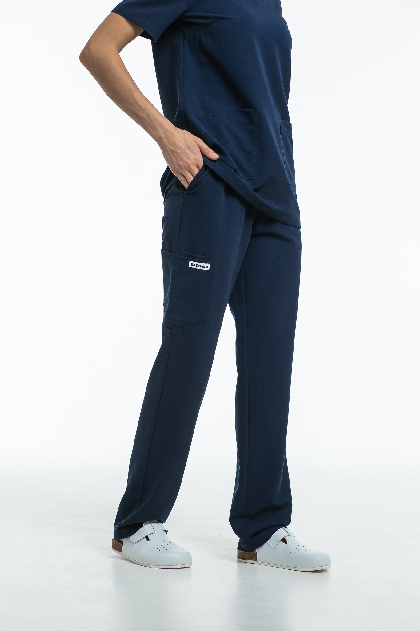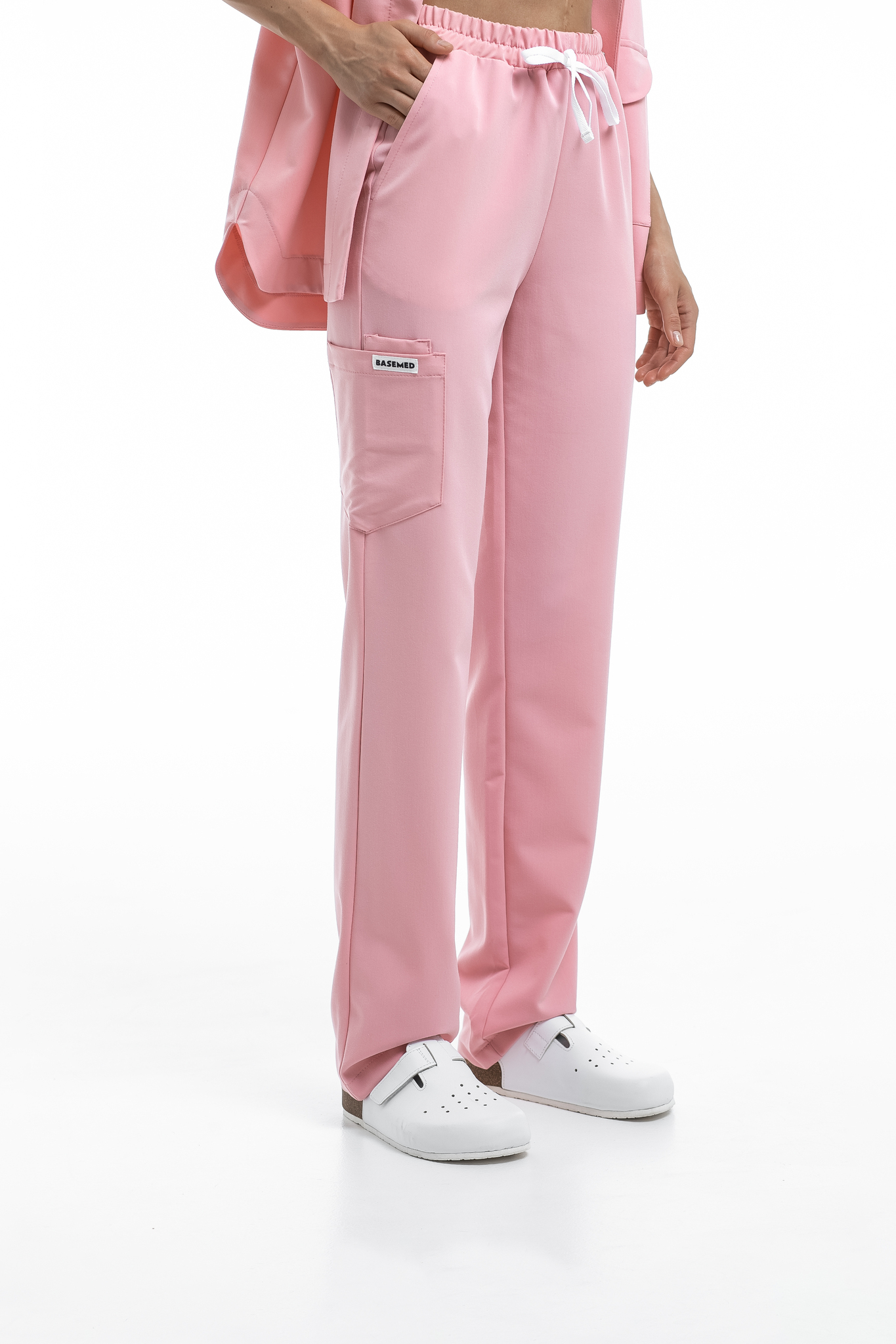 Прямые брюки на резинке и на завязках. Эта модель позволит с комфортом отработать даже самую долгую смену за счет удобной посадки и возможности отрегулировать брюки в зоне талии. На брюках есть 6 карманов: 2 передних, 2 задних и 2 накладных на левой штанине.