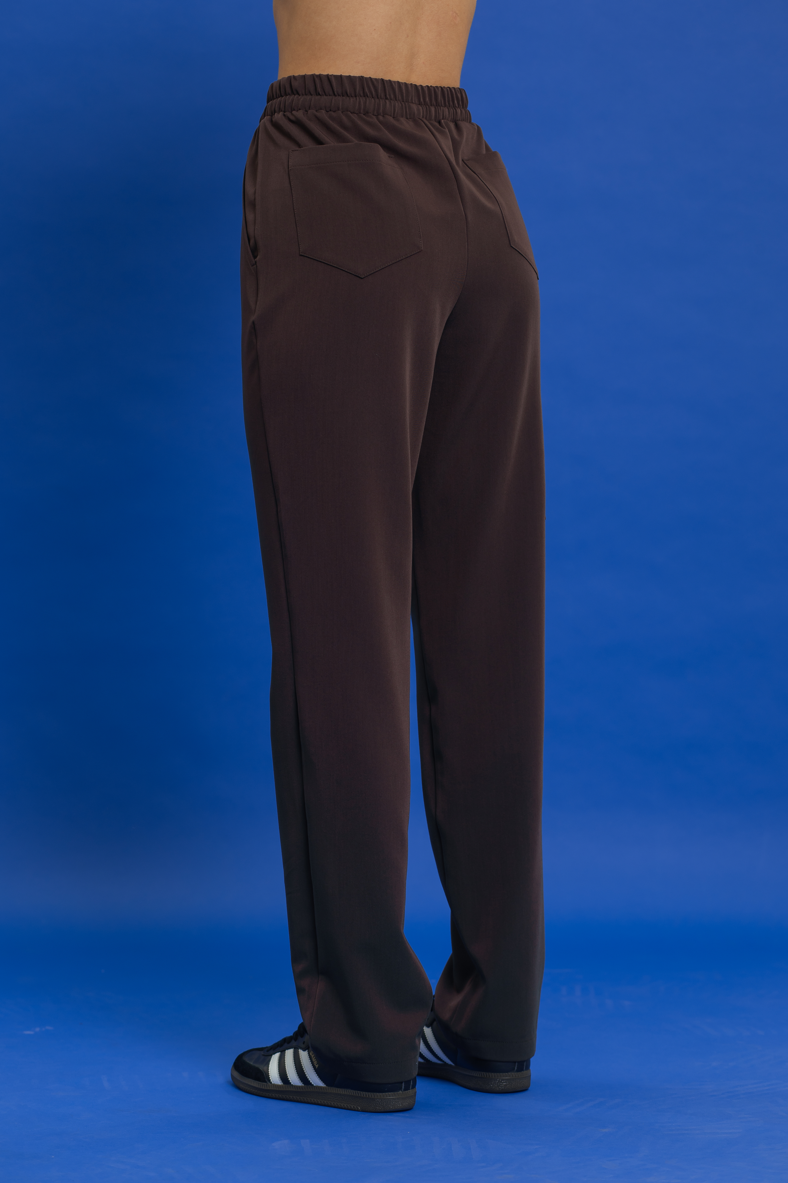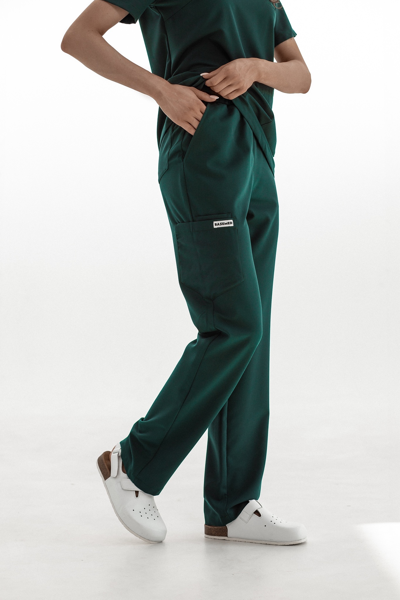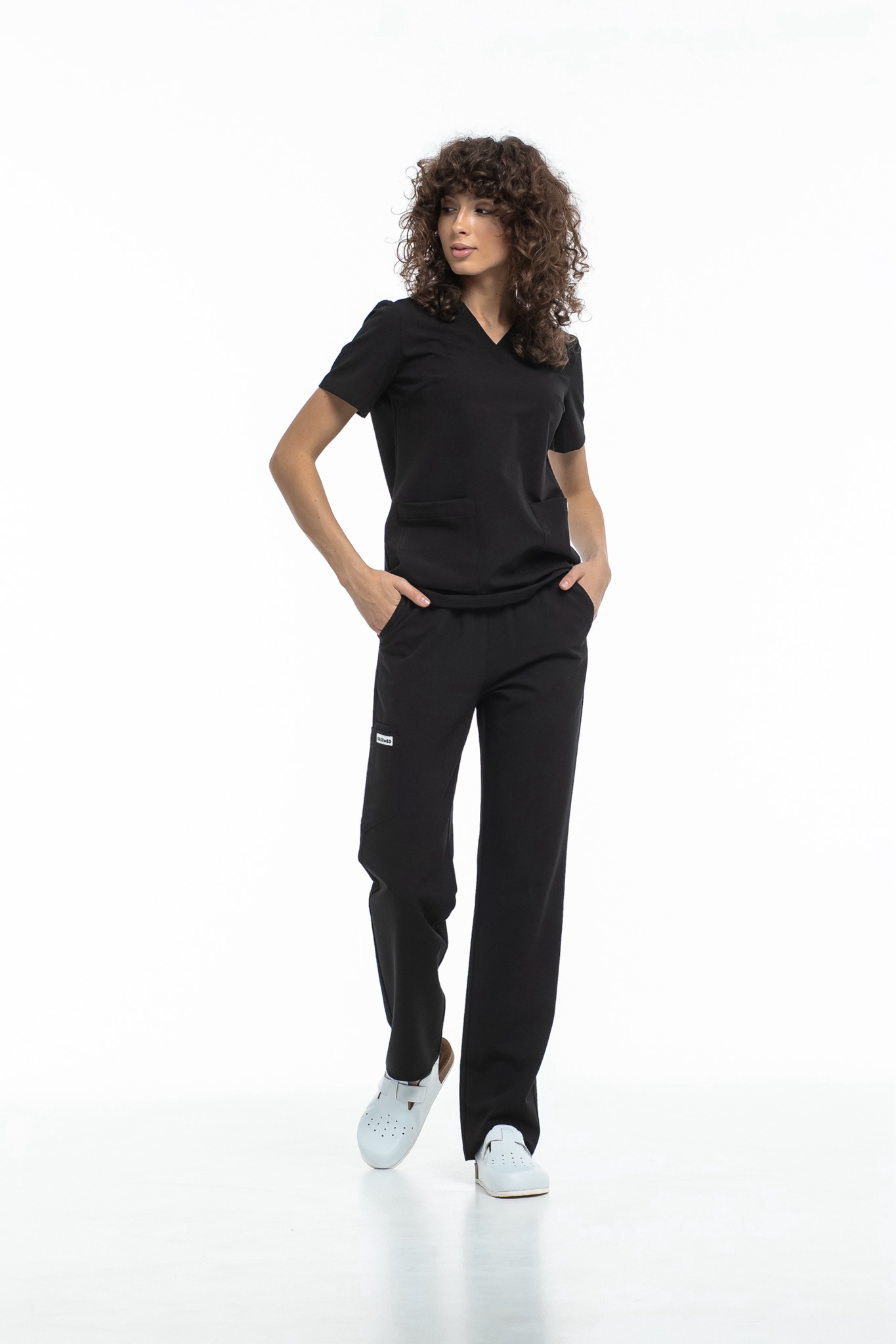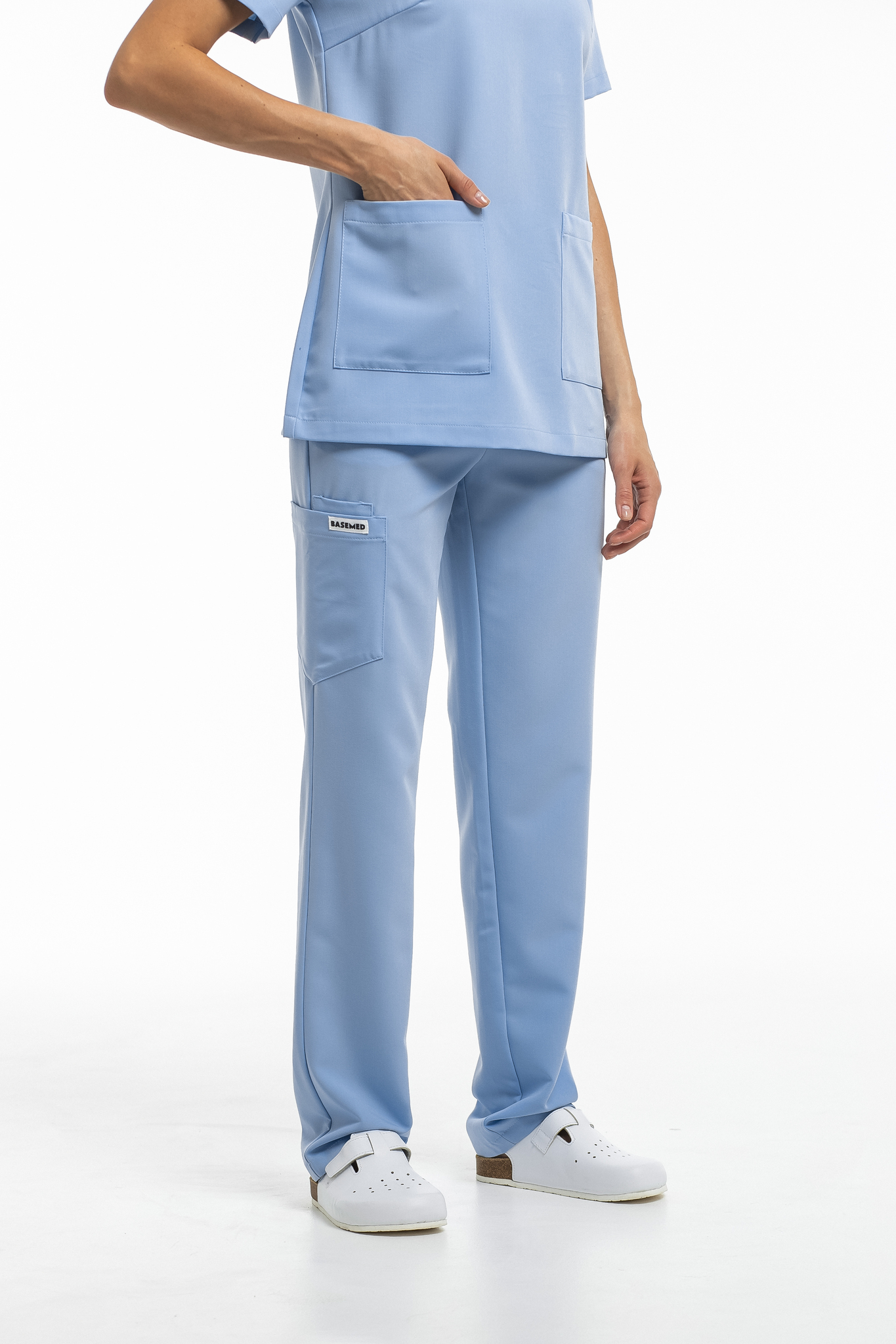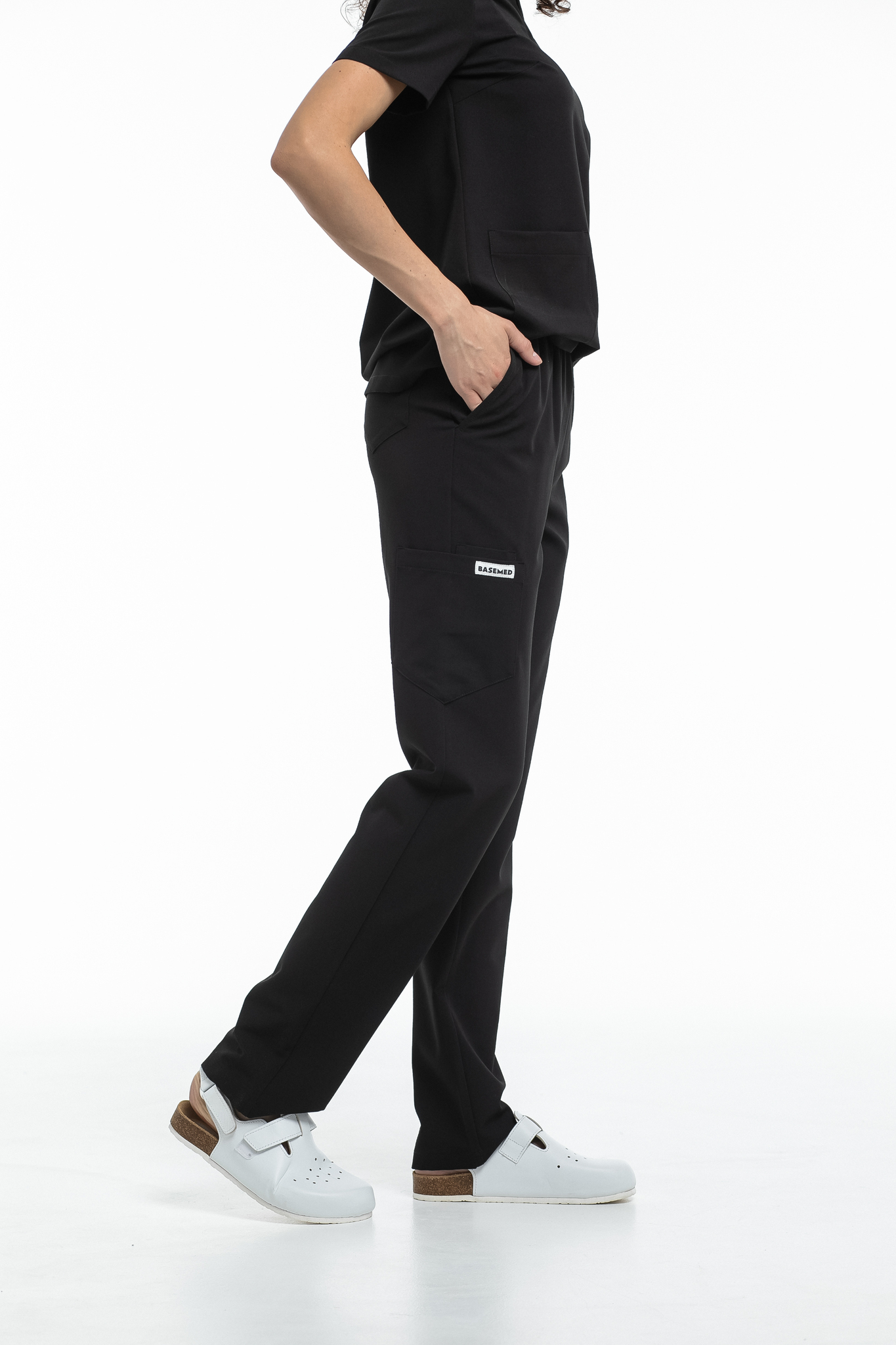 Прямые брюки на резинке и на завязках. Эта модель позволит с комфортом отработать даже самую долгую смену за счет удобной посадки и возможности отрегулировать брюки в зоне талии. На брюках есть 6 карманов: 2 передних, 2 задних и 2 накладных на левой штанине.