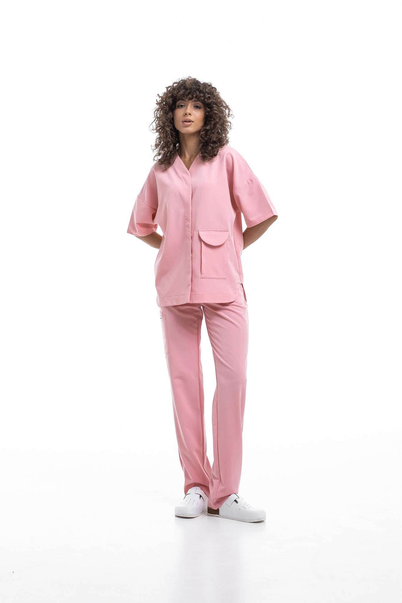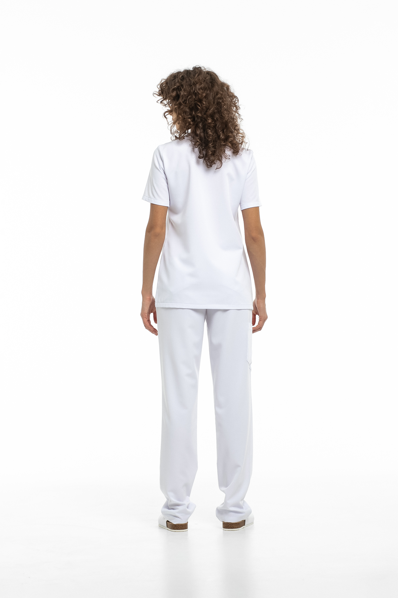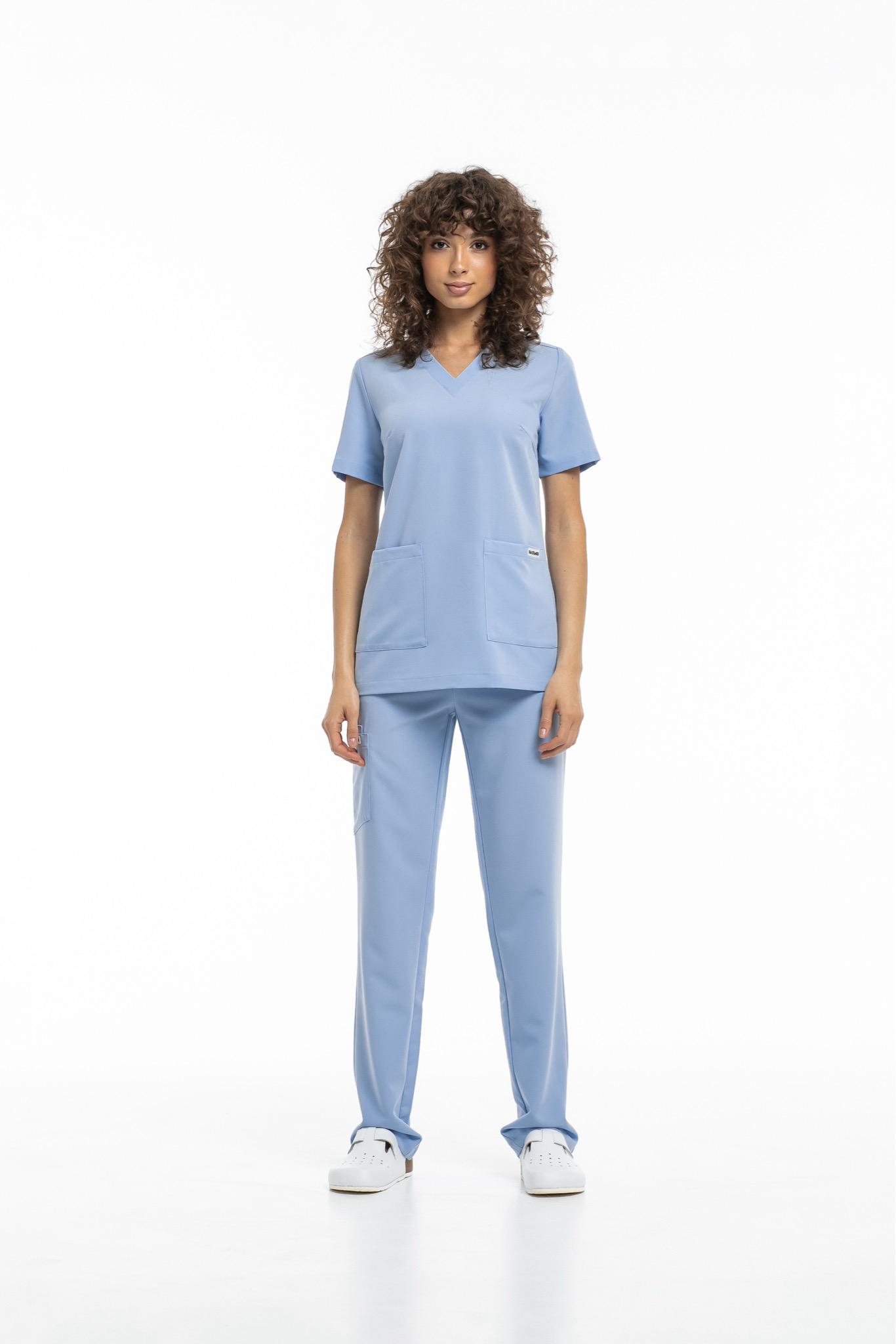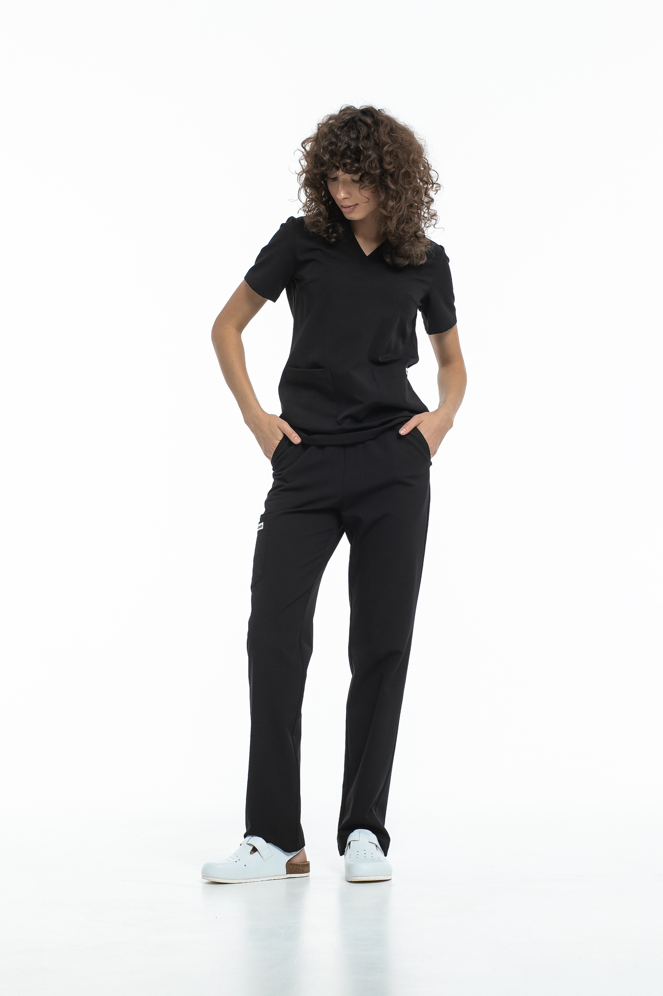 Прямые брюки на резинке и на завязках. Эта модель позволит с комфортом отработать даже самую долгую смену за счет удобной посадки и возможности отрегулировать брюки в зоне талии. На брюках есть 6 карманов: 2 передних, 2 задних и 2 накладных на левой штанине.