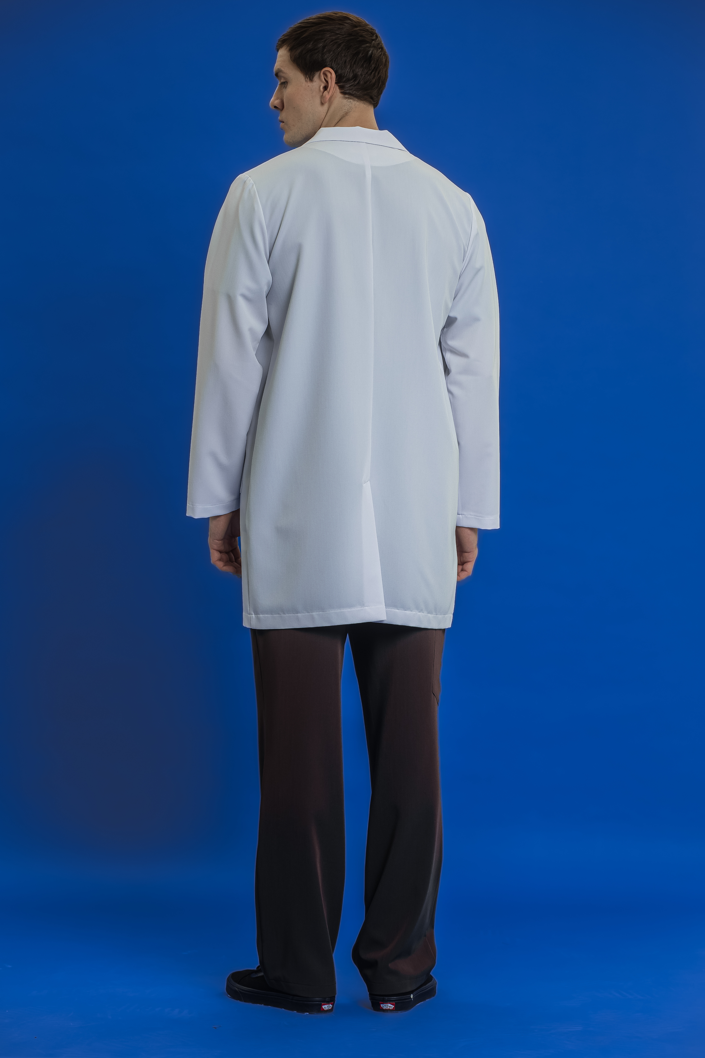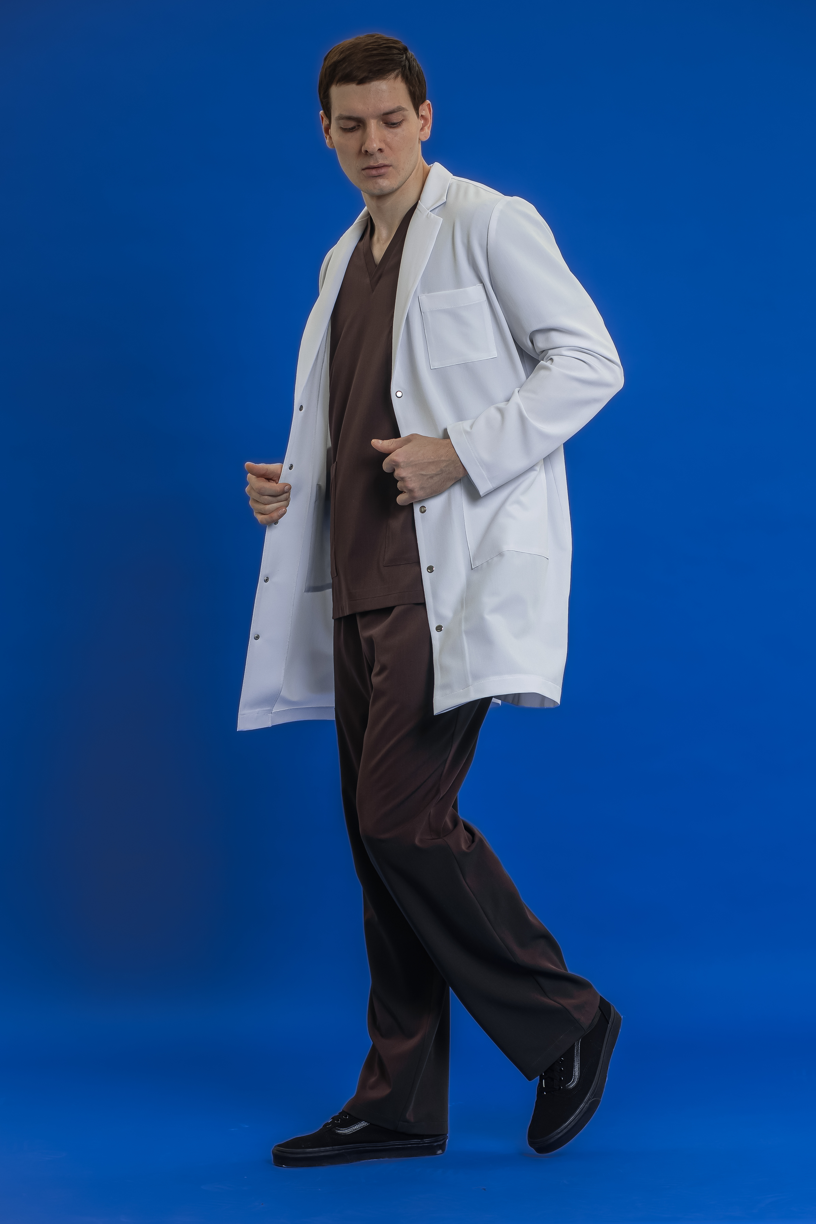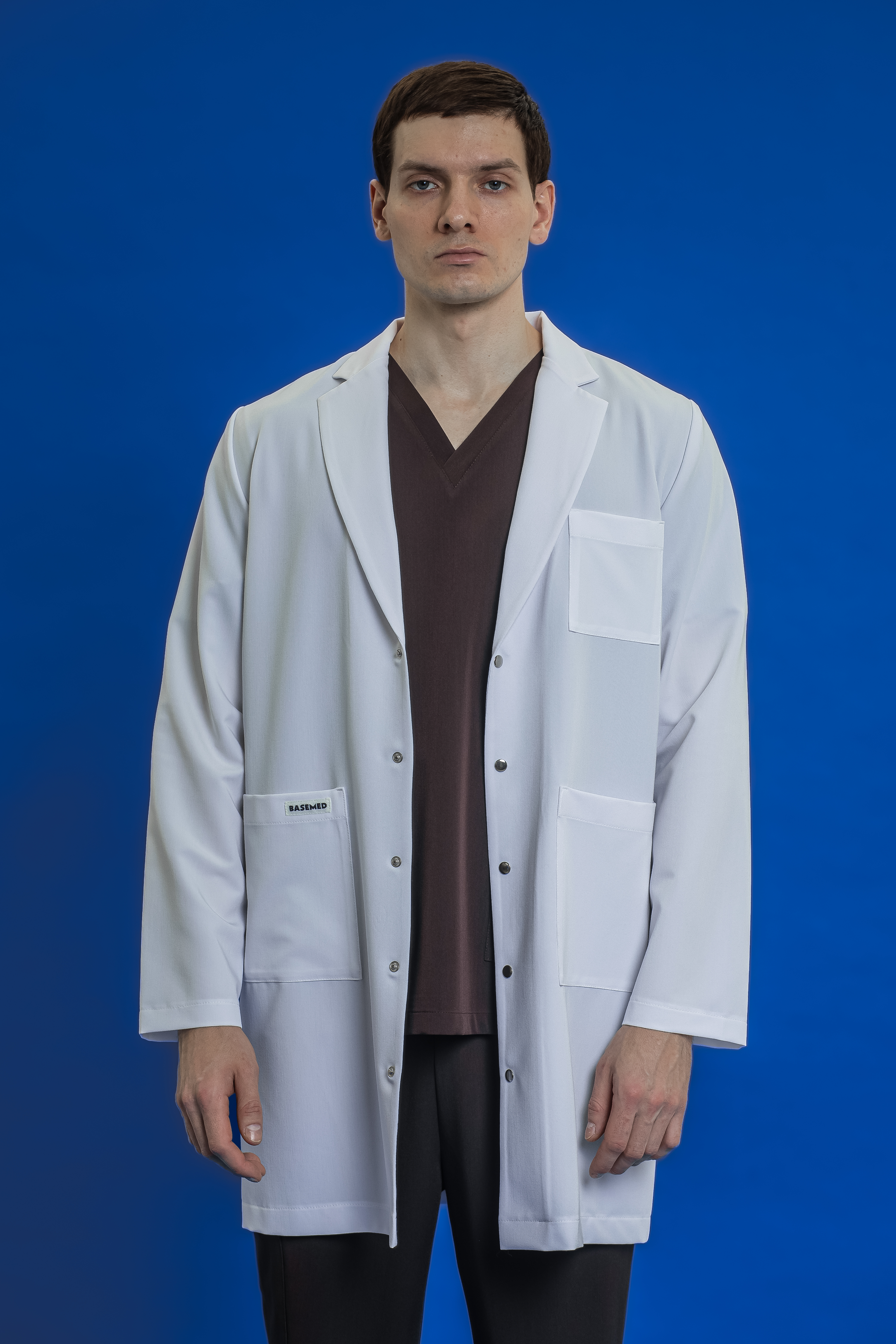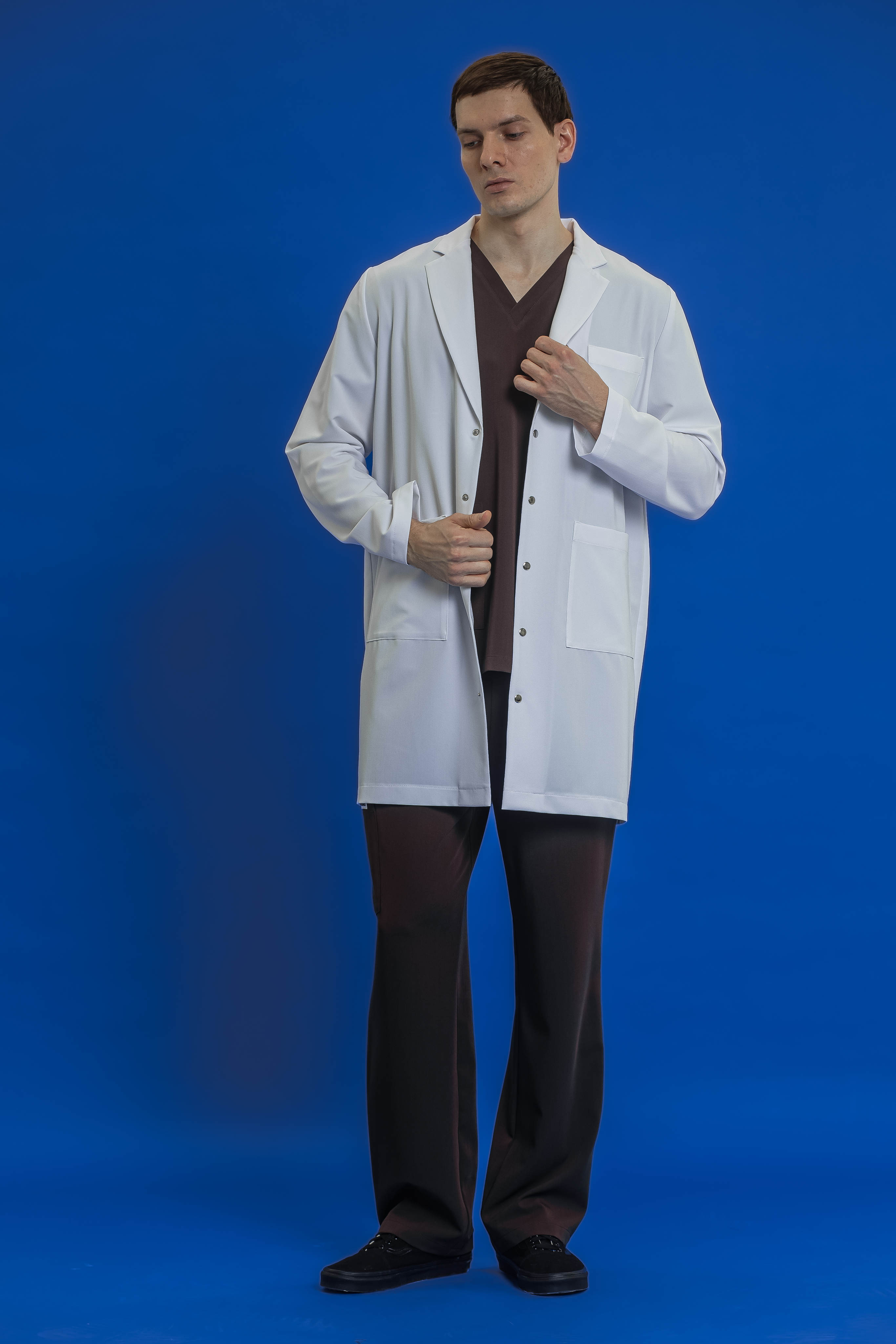 Классический медицинский халат в наиболее привычном и востребованном силуэте. Модель с V-образным вырезом и лацканами выглядит строго, профессионально и аккуратно, сохраняя узнаваемый медицинский образ, который ассоциируется с чистотой и доверием. Халат имеет три кармана: два накладных спереди и один нагрудный.